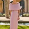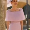 O decote envolvente em capa adiciona um toque de sofisticação, enquanto os detalhes em pedraria nos ombros e no cinto proporcionam um brilho subtil e refinado.