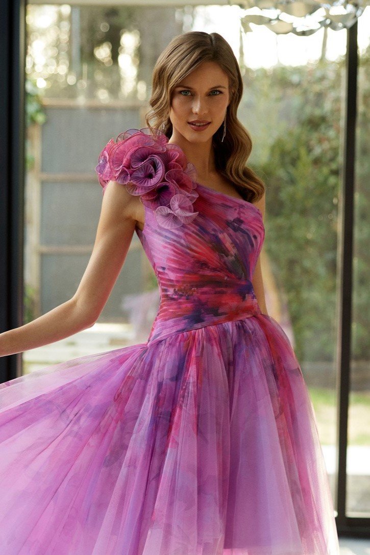 O tecido estampado em tons de fúcsia, lilás e rosa adiciona um efeito artístico e moderno, enquanto a aplicação de flores volumosas no ombro adiciona um toque dramático e sofisticado. O drapeado na cintura modela o corpo com delicadeza, acentuando a silhueta de forma harmoniosa.