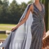 O brilho deslumbrante do tecido, revestido por pedraria bordada em padrões radiantes nos tons de prateado e azul , faz deste vestido uma peça única. A capa esvoaçante sem mangas , confecionada em tecido musseline leve e translúcida, adiciona um toque de realeza, proporcionando um efeito dramático e sofisticado ao caminhar.