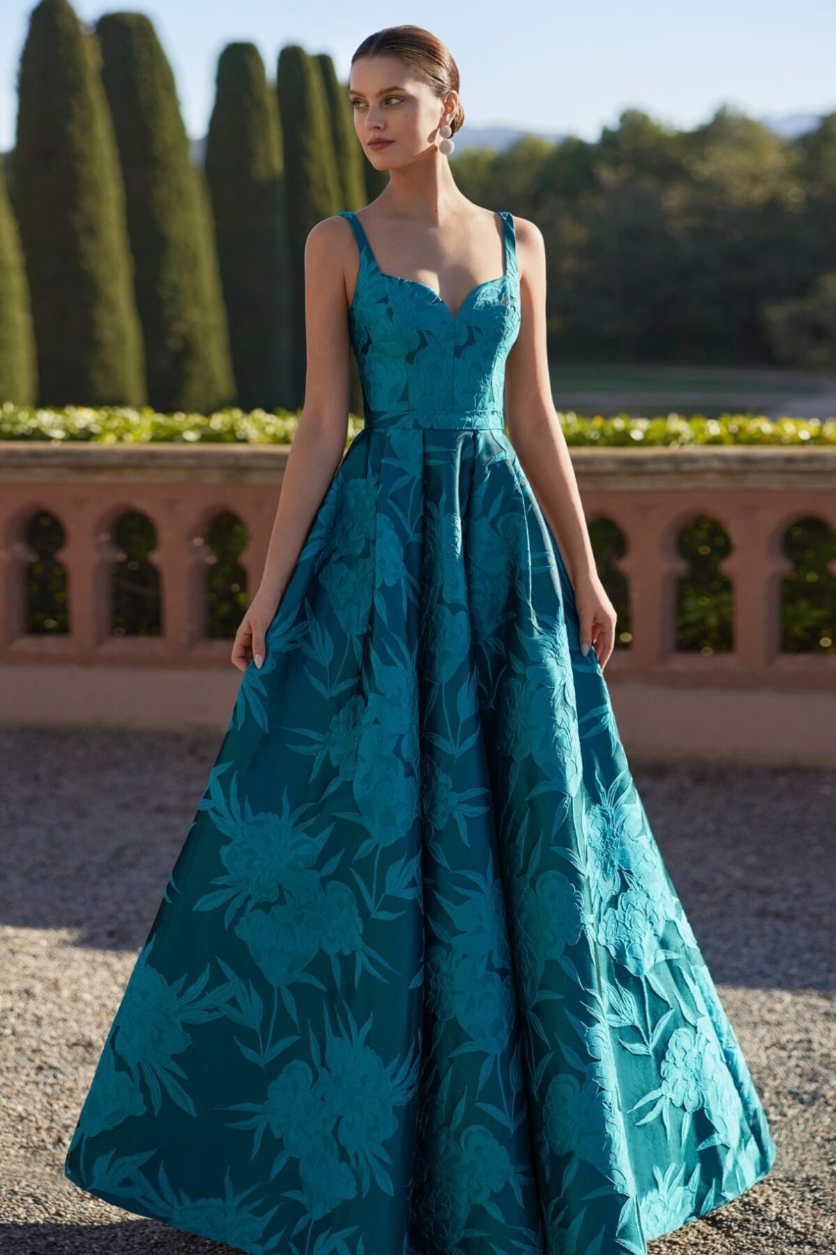 Este vestido longo de festa da Marfil Barcelona , confecionado em brocado sofisticado, é a escolha perfeita para um look atemporal e elegante.