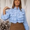 O modelo possui múltiplas camadas de folhos na parte frontal e nas mangas, criando um visual delicado e feminino. O gola subida com folho e o fecho de botões frontais completam o estilo clássico e elegante da peça, tornando-a ideal tanto para ocasiões formais como para um look de dia mais requintado.