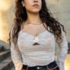 Um dos grandes destaques desta blusa é a aplicação metálica central, estrategicamente colocada no decote, que acrescenta um detalhe moderno e diferenciador. Este pormenor transforma uma peça clássica numa opção contemporânea, perfeita para compor looks que se destacam pela originalidade. O decote em formato coração, complementado pela renda transparente, proporciona um equilíbrio entre sensualidade e sofisticação.