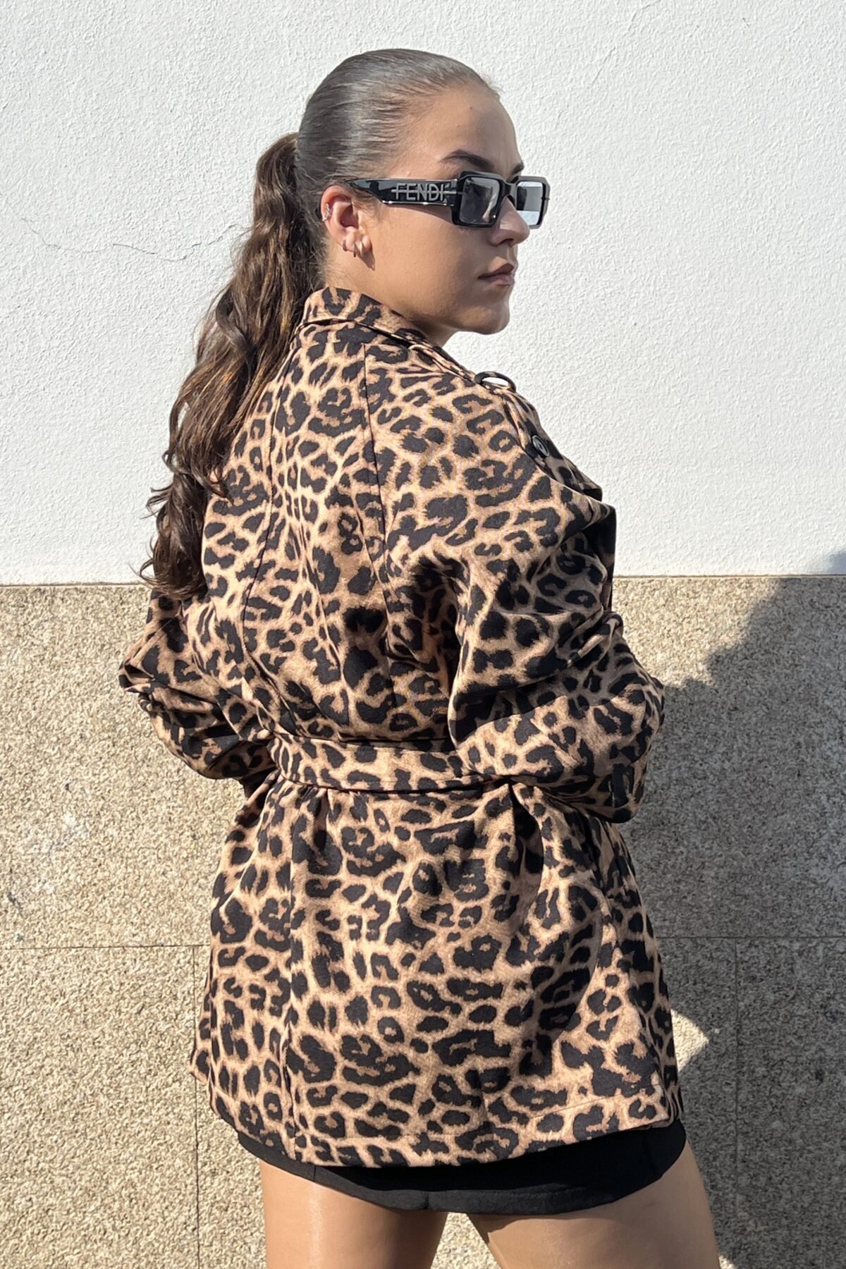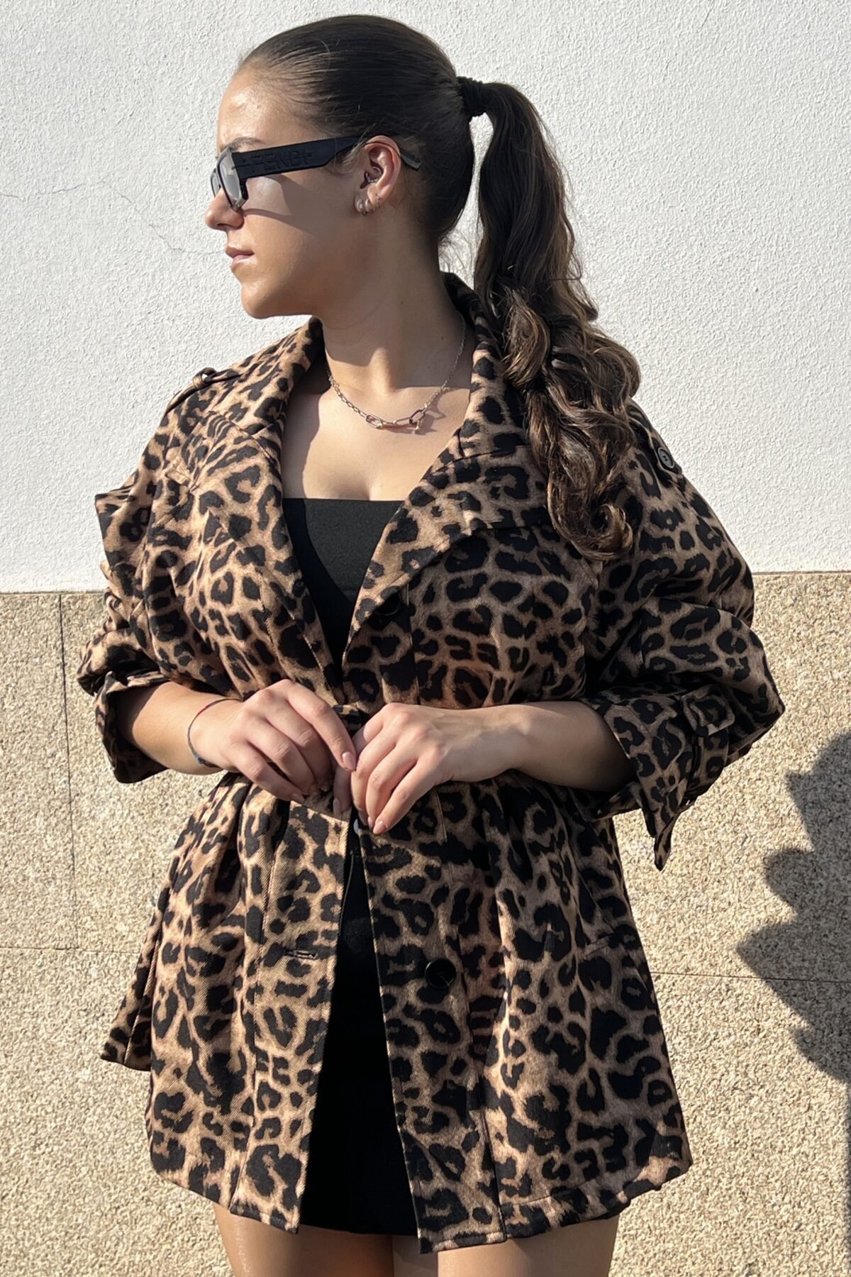 O casaco animal print leopardo com cinto é a peça ideal para quem deseja criar looks ousados, modernos e cheios de personalidade. O padrão leopardo, sendo um clássico intemporal, acrescenta força ao visual e transforma qualquer coordenado básico numa combinação impactante. Além disso, este modelo apresenta um corte elegante que favorece a silhueta de forma natural.