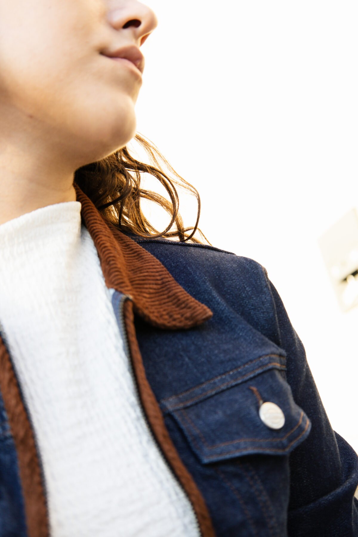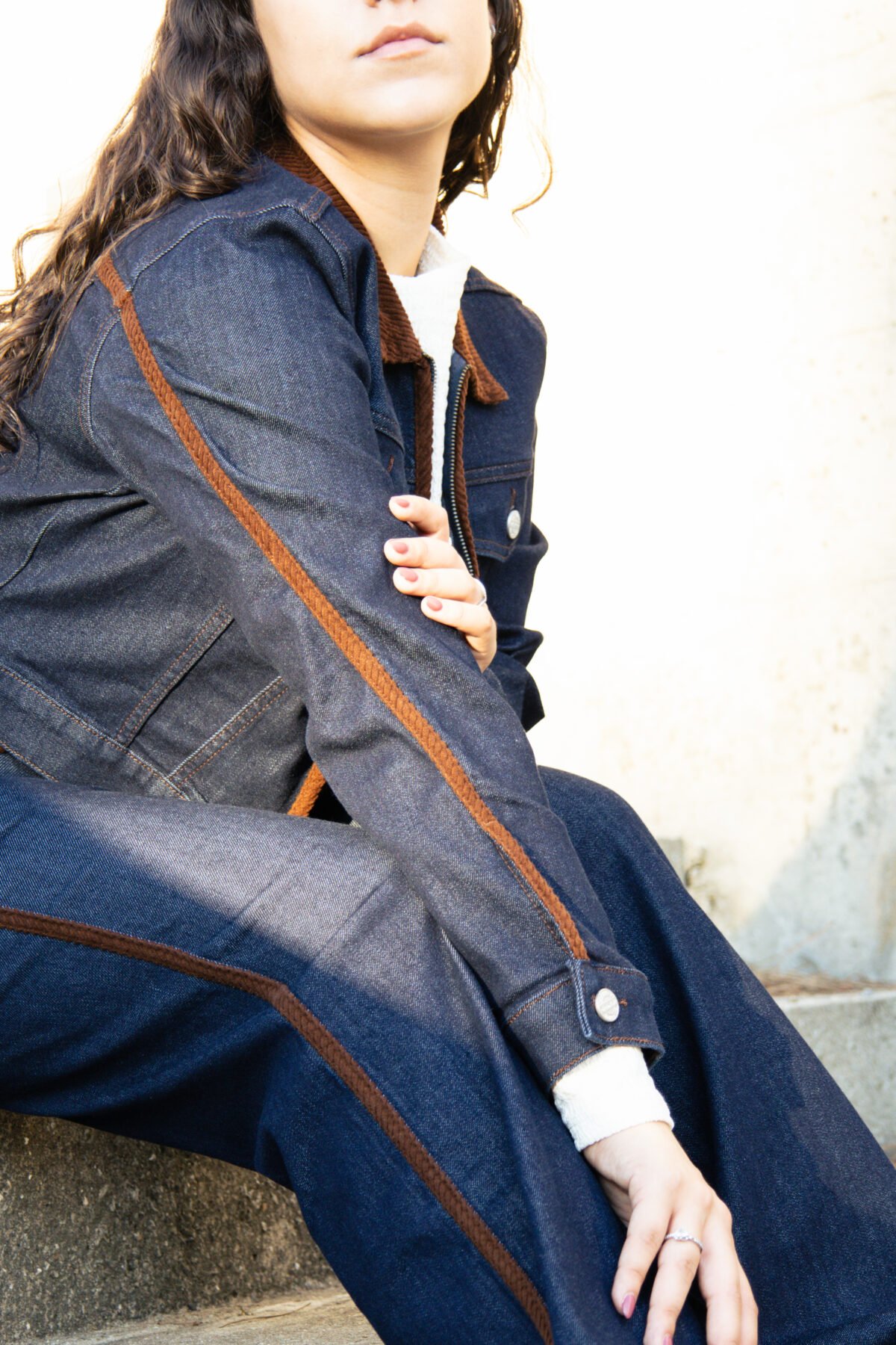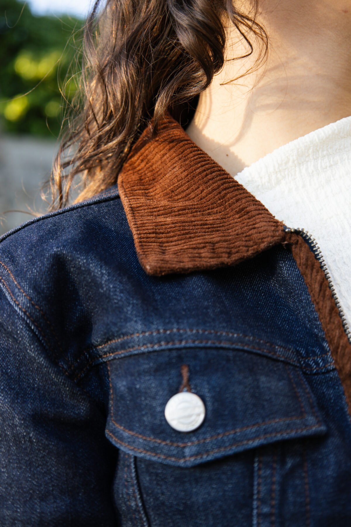 • Casaco em ganga azul escura com detalhes em bombazina castanha