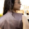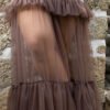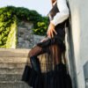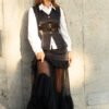 A saia, em tule leve e translúcido, introduz movimento e um efeito visual marcante à composição. O design fluído, com camadas delicadamente franzidas e acabamento volumoso na barra, cria um contraste interessante com a estrutura do colete em viscose. O resultado é uma peça feminina, ousada e sofisticada, que brinca com transparências e texturas para um visual impactante.