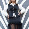 A versatilidade vai além do conjunto completo: o colete pode ser utilizado separadamente, coordenado com camisas clássicas, calças de alfaiataria ou até jeans para um estilo moderno e sofisticado. Já a saia em tule pode ser combinada com blusas mais simples para criar looks elegantes, com o equilíbrio perfeito entre ousadia e feminilidade.