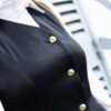 Este conjunto de colete e saia combina sofisticação, ousadia e modernidade, sendo a escolha ideal para quem aprecia moda com personalidade. O colete é confecionado em viscose acetinada de alta qualidade, um tecido leve e confortável que proporciona um caimento elegante e suave ao vestir. O corte estruturado valoriza a silhueta, enquanto os botões metálicos dourados acrescentam um toque de luxo e distinção, destacando-se como detalhe refinado.