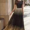 A saia esbanja grandiosidade com seu tecido plissado em um degradê impactante do preto ao dourado, evocando luxo e glamour em cada movimento. O efeito metalizado ilumina uma peça com sofisticação, garantindo uma presença inesquecível em qualquer evento.