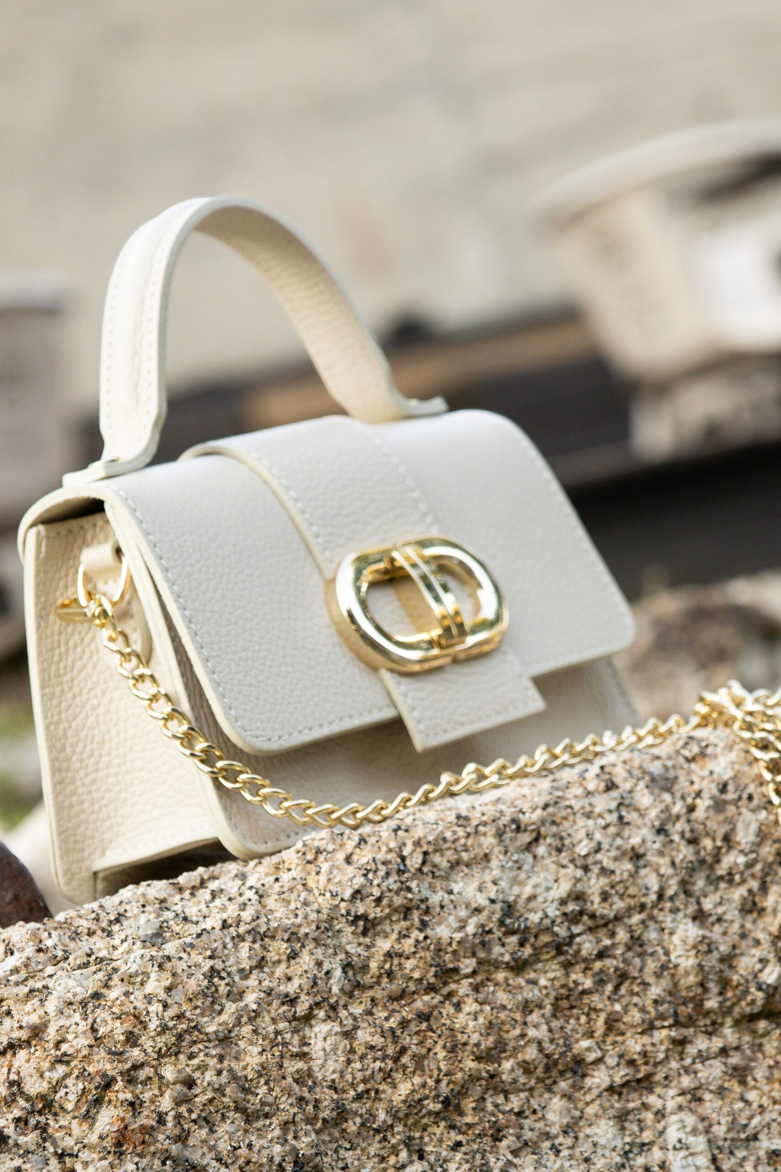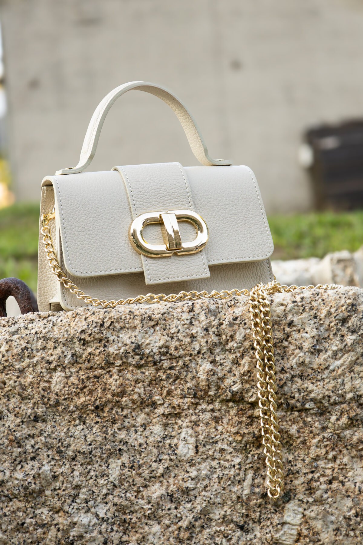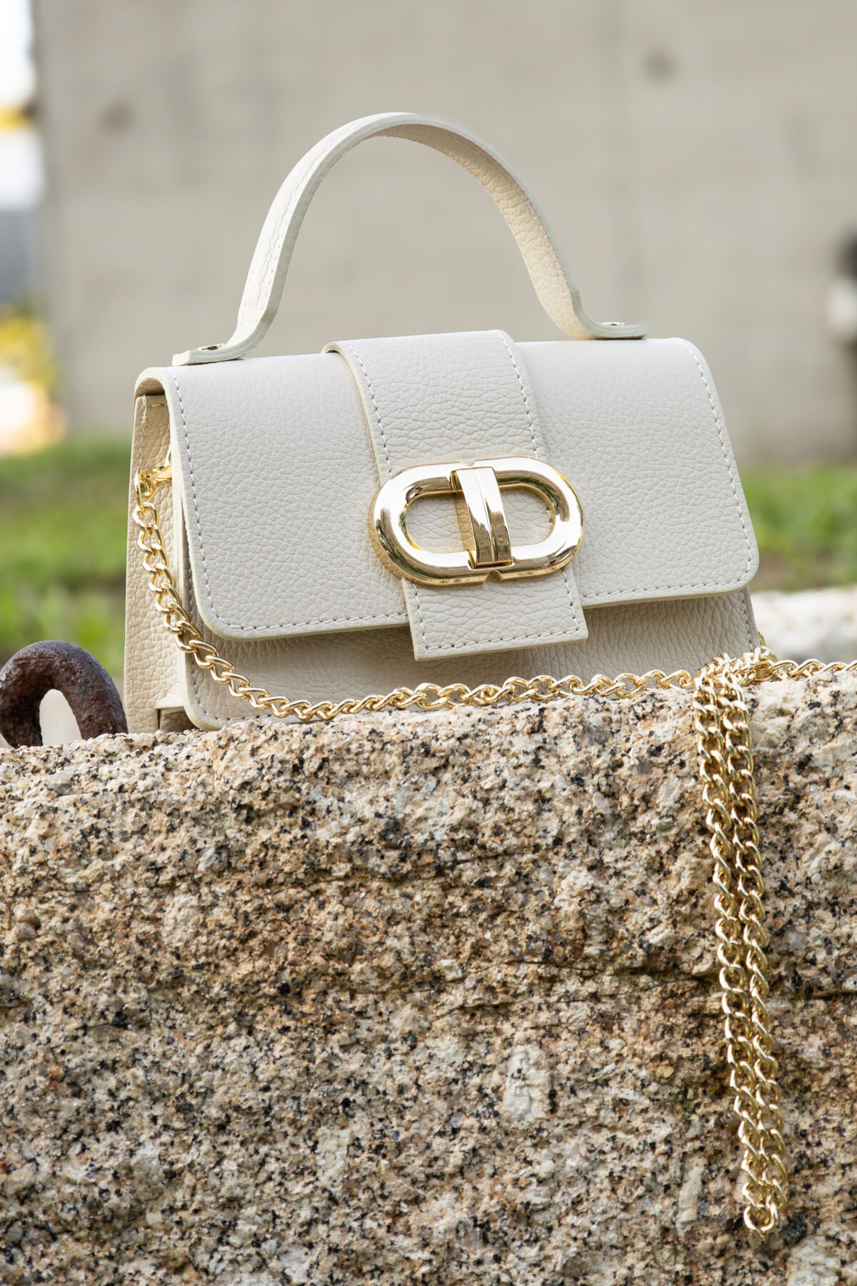 Esta mini bag feminina bege é a combinação ideal entre sofisticação e praticidade. O seu design estruturado em material texturizado adiciona um toque moderno e requintado, enquanto o fecho metálico em dourado acrescenta um detalhe luxuoso. A alça de corrente removível permite usá-la tanto ao ombro como a tiracolo, adaptando-se a diferentes estilos e ocasiões. Compacta, mas espaçosa o suficiente para levar os essenciais do dia a dia, é perfeita para completar tanto looks casuais como elegantes.