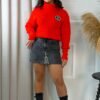 Outra grande vantagem desta saia de ganga cinza é a sua versatilidade. Por exemplo, pode ser usada com camisolas de malha, como o modelo laranja apresentado nas fotos, criando um look vibrante e moderno. No entanto, também funciona muito bem com tops, camisas leves ou blusas românticas.