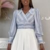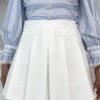 Mini saia plissada em tom azul bebê, com detalhe de bolsos decorativos na cintura e caimento estruturado que proporciona movimento e elegância. Um modelo delicado e cheio de charme, perfeito para compor looks leves, femininos e super modernos!