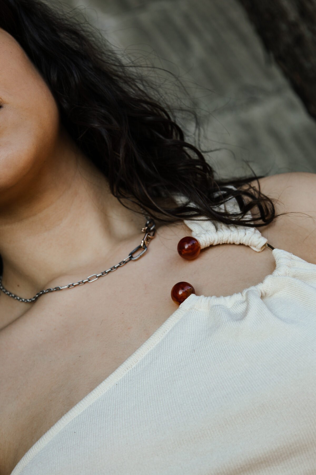 O grande destaque vai para a sua alça trabalhada com missangas decorativas, que acrescentam um toque artesanal e elegante, transformando uma peça básica numa escolha distinta. O detalhe das missangas, em tom âmbar, cria um contraste delicado com a suavidade do tecido, tornando o top um elemento central em qualquer look.