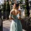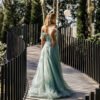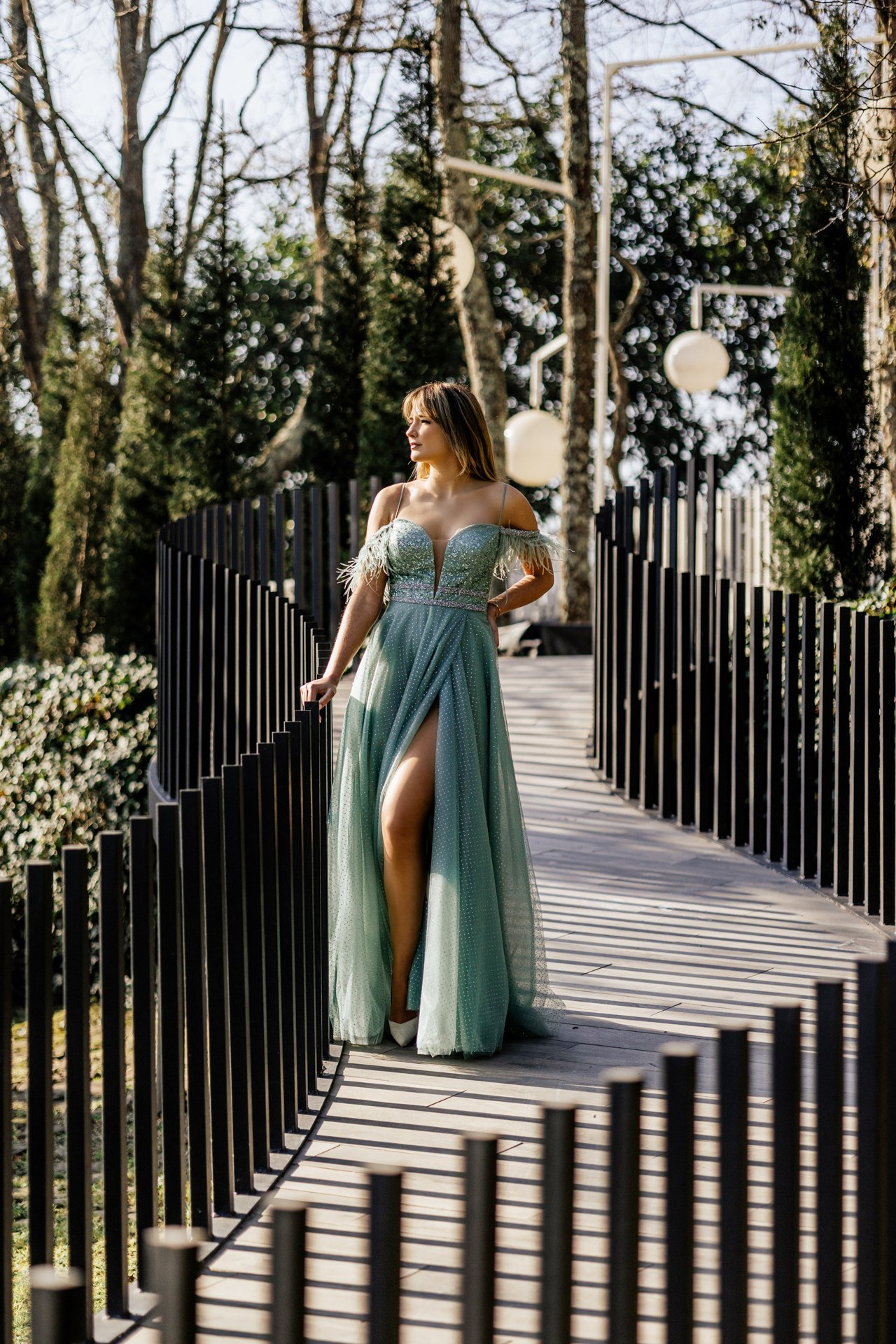 A zona do busto é adornada com brilhantes, criando uma cintura marcada e cintilante que valoriza a silhueta. A saia fluida e com volume leve, em tule sobreposto, apresenta uma racha frontal que acrescenta sensualidade ao movimento, sem perder a elegância. O fecho tipo espartilho nas costas ajusta-se perfeitamente ao corpo, proporcionando conforto e um encaixe ideal.