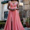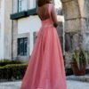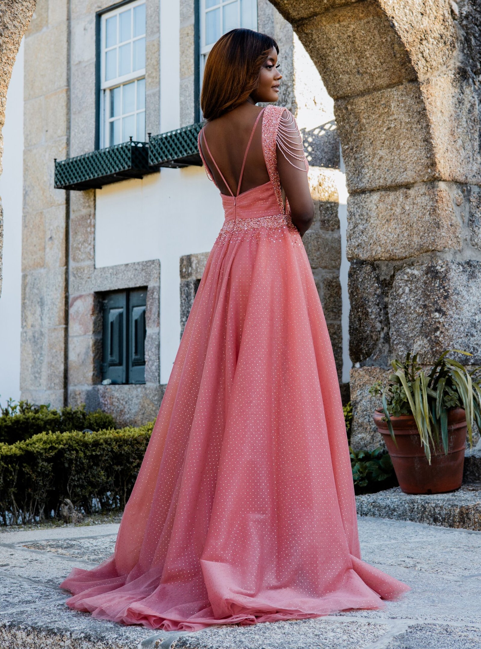 Este deslumbrante vestido em tom coral é uma ode à elegância e ao encanto feminino. O corpete justo, ricamente adornado com delicadas pérolas e finos fios de pedraria, desenha o decote em V e estende-se pelos ombros em mangas de efeito corrente, criando um visual sofisticado e luminoso. A cintura é cintada e marcada com uma faixa também bordada com pedraria, acentuando a silhueta com subtileza.