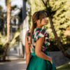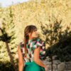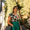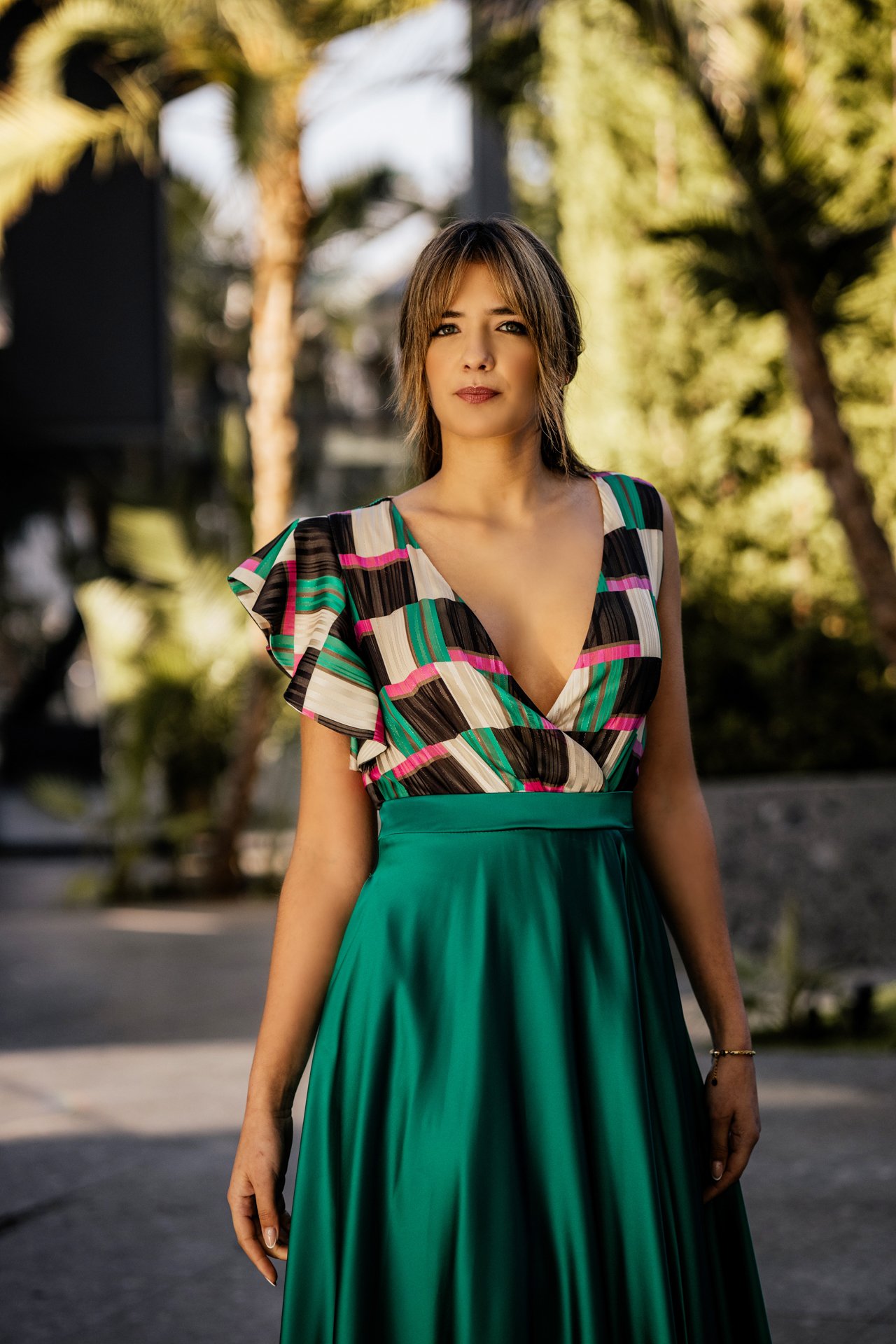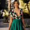 Com um corpo em tecido estampado que mistura tons de verde-esmeralda, rosa-fúchsia, preto e bege, apresenta um decote em V profundo e com um folho delicado, criando um efeito romântico e descontraído. A cintura marcada dá lugar a uma saia fluida em cetim verde com brilho subtil, que desliza graciosamente com o movimento. A abertura frontal na perna acrescenta ousadia na medida certa, equilibrando o look com sofisticação. Nas costas, o modelo fecha com fecho invisível e destaca-se pelas costas cobertas. Tem bolsos laterais e é totalmente forrado.