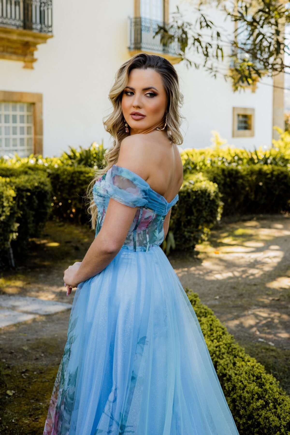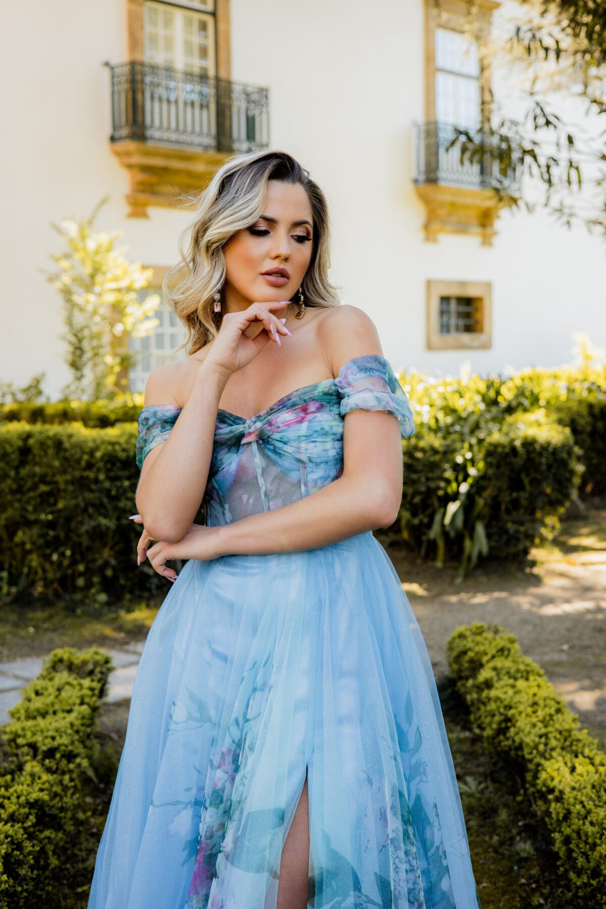 Este modelo é ideal para convidadas de casamento, madrinhas ou eventos formais ao fim da tarde ou à noite, sobretudo ao ar livre, onde o brilho subtil do tule se destaca com elegância. É perfeito para mulheres que procuram um look romântico, requintado e marcante.