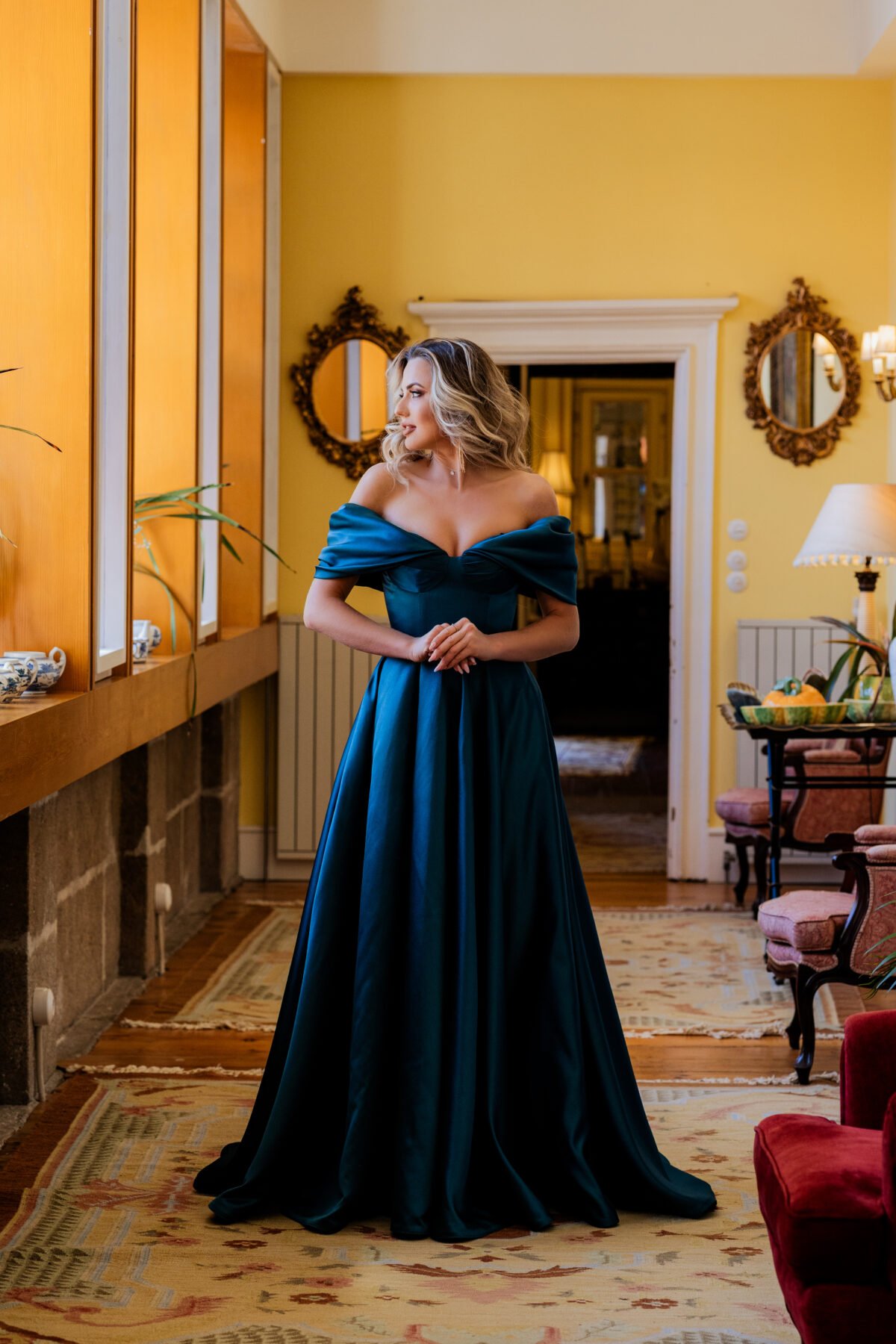 Deslumbra com este vestido longo em mikado azul petróleo, uma escolha sofisticada e elegante para ocasiões especiais.