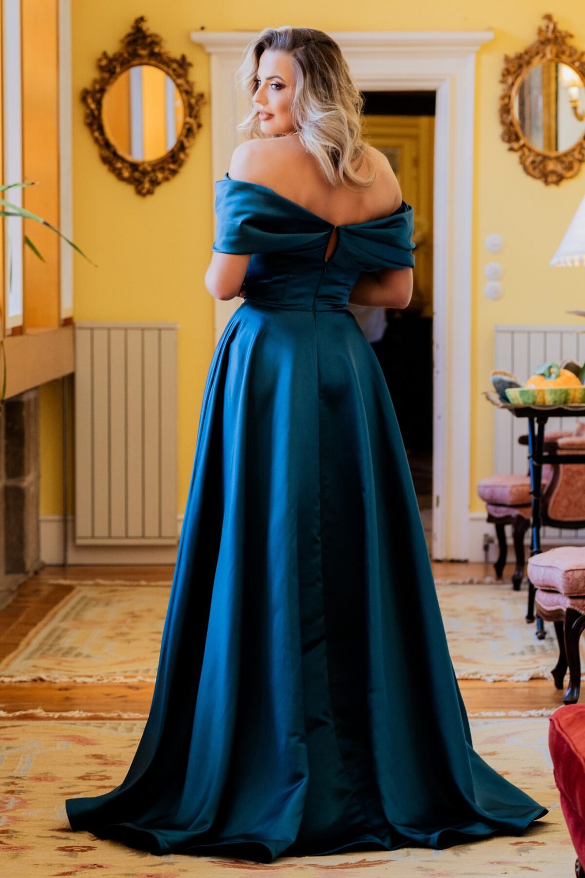Deslumbra com este vestido longo em mikado azul petróleo, uma escolha sofisticada e elegante para ocasiões especiais.