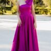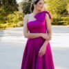 Este vestido é a definição de elegância fresca e contemporânea. Com um corte assimétrico de ombro único e um laço estruturado amovível, traz um toque irreverente e sofisticado ao clássico vestido de gala. O tecido em mikado acetinado possui um brilho delicado e um cair fluido que valoriza a silhueta com naturalidade.