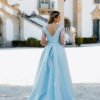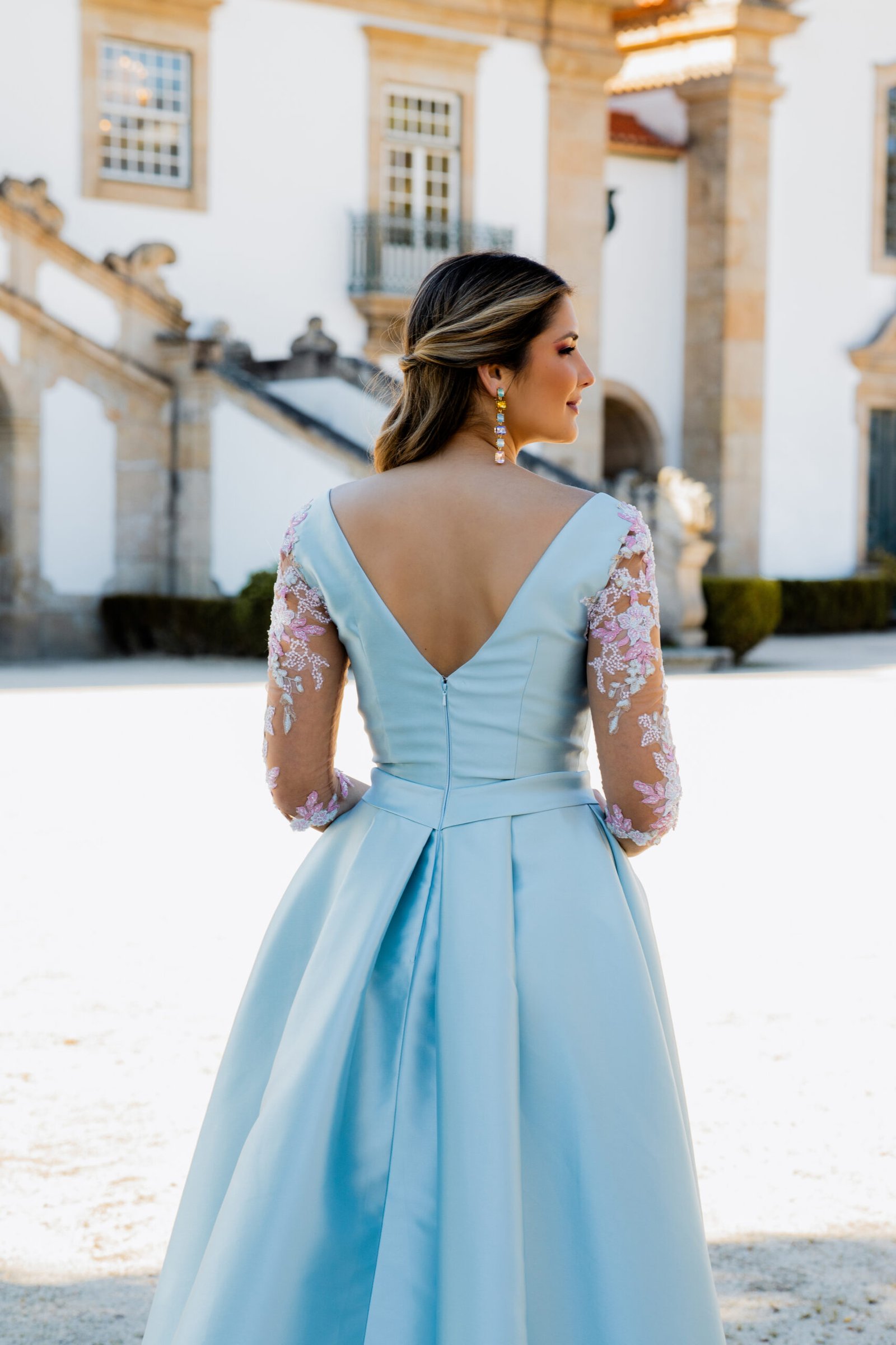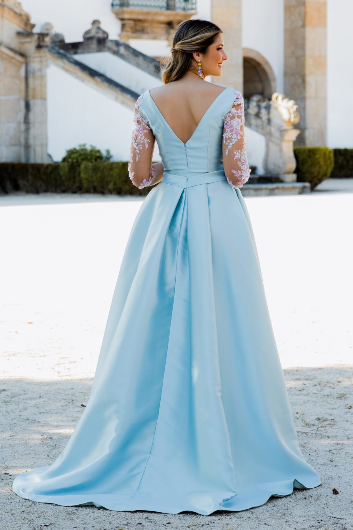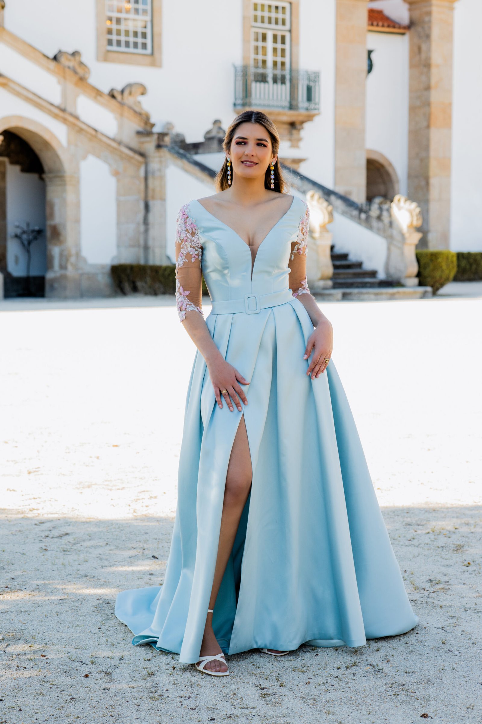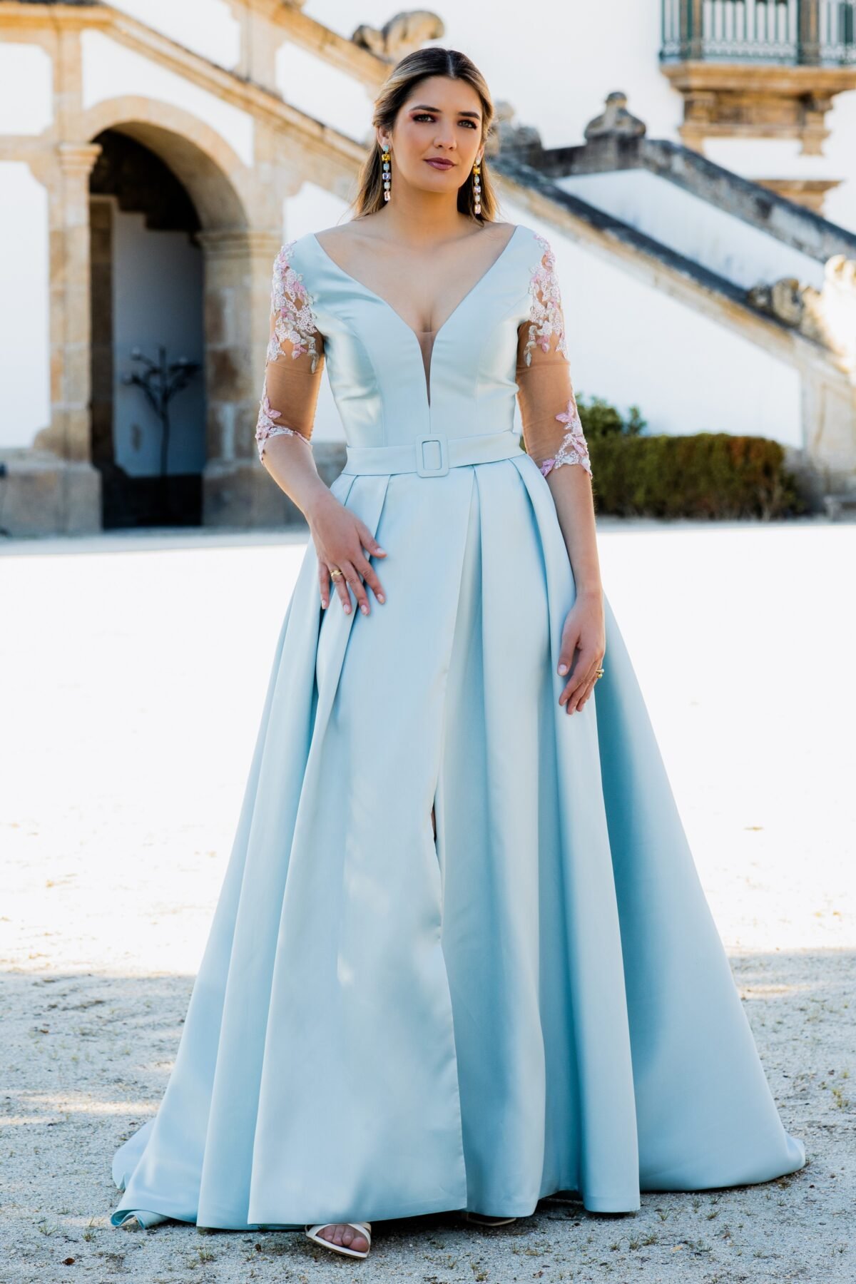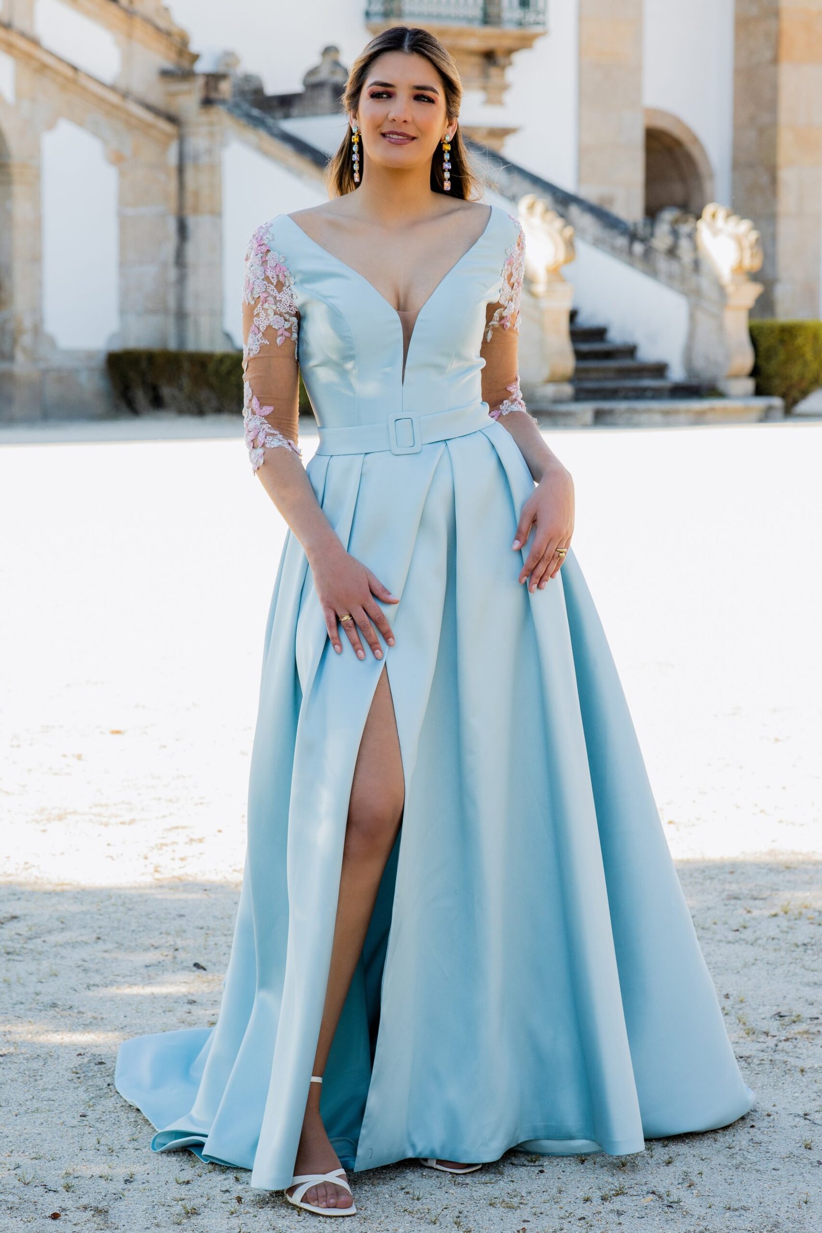 Este vestido longo em tom azul-céu apresenta um corte majestoso e feminino, perfeito para ocasiões especiais. Confecionado em micado estruturado, o modelo possui um corpete ajustado com decote em V profundo que se prolonga nas costas, valorizando a silhueta com elegância. A cintura é marcada por um cinto do mesmo tecido, acentuando a forma. As mangas em tule transparente com bordados florais rosa e branco acrescentam um toque romântico e delicado à composição. A saia ampla com pregas confere-lhe movimento, e uma racha frontal subtil sugere sensualidade com sofisticação.