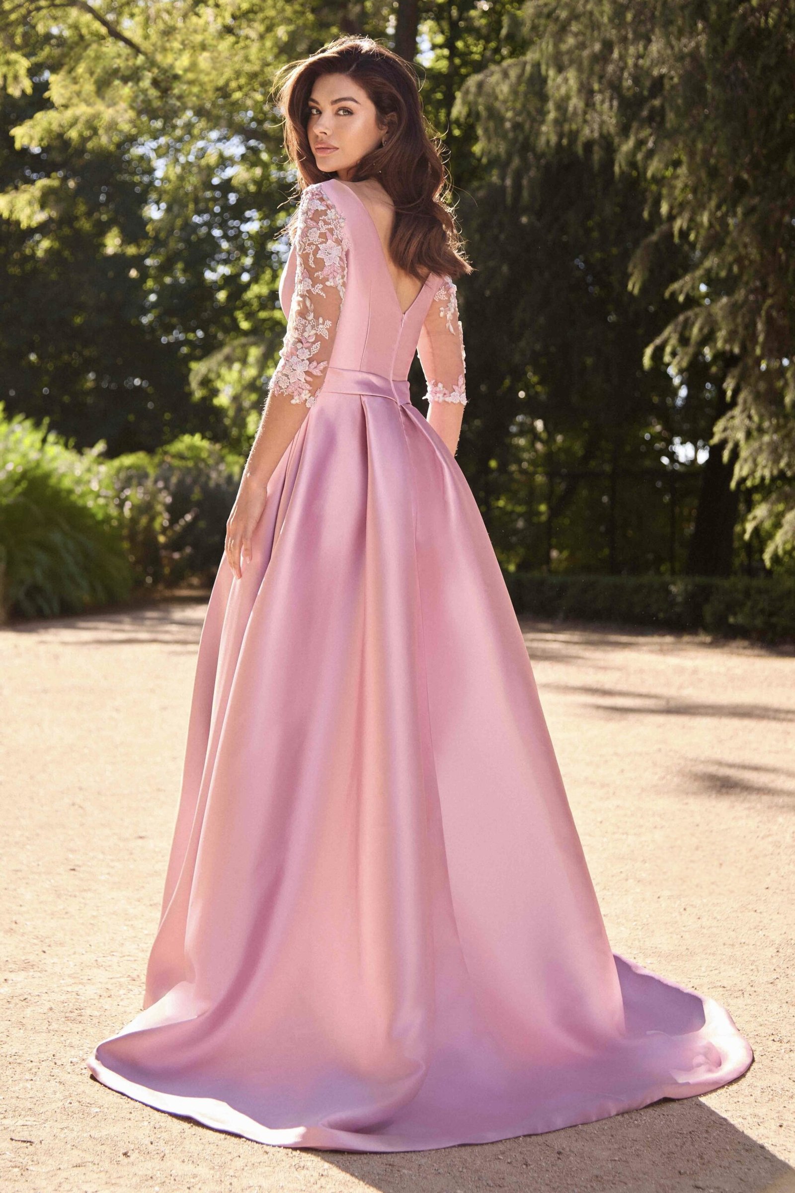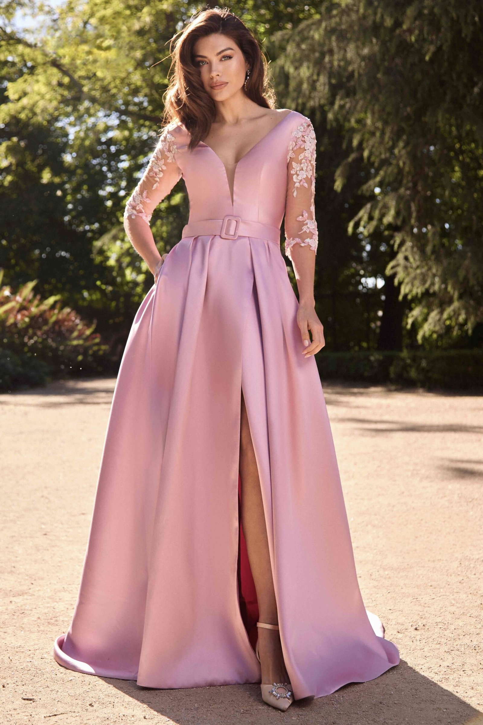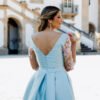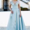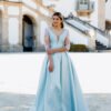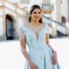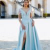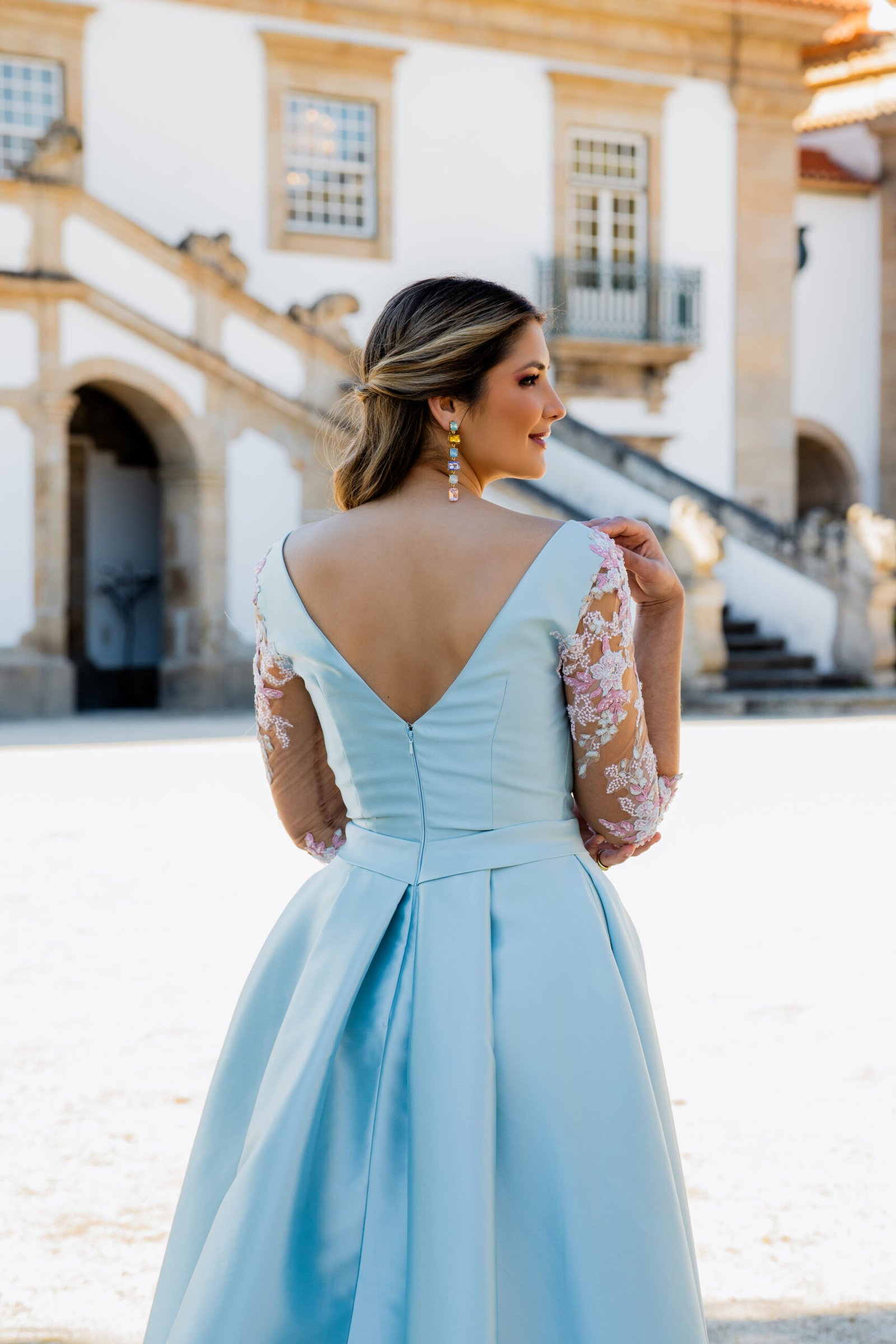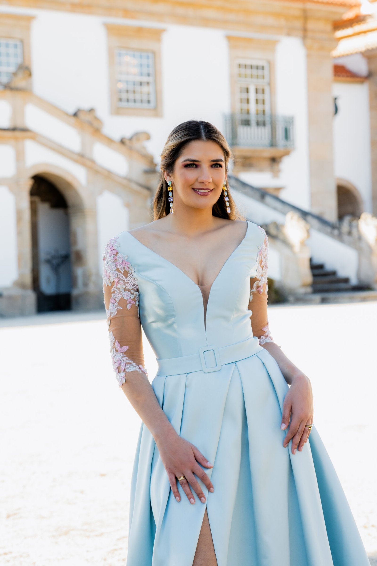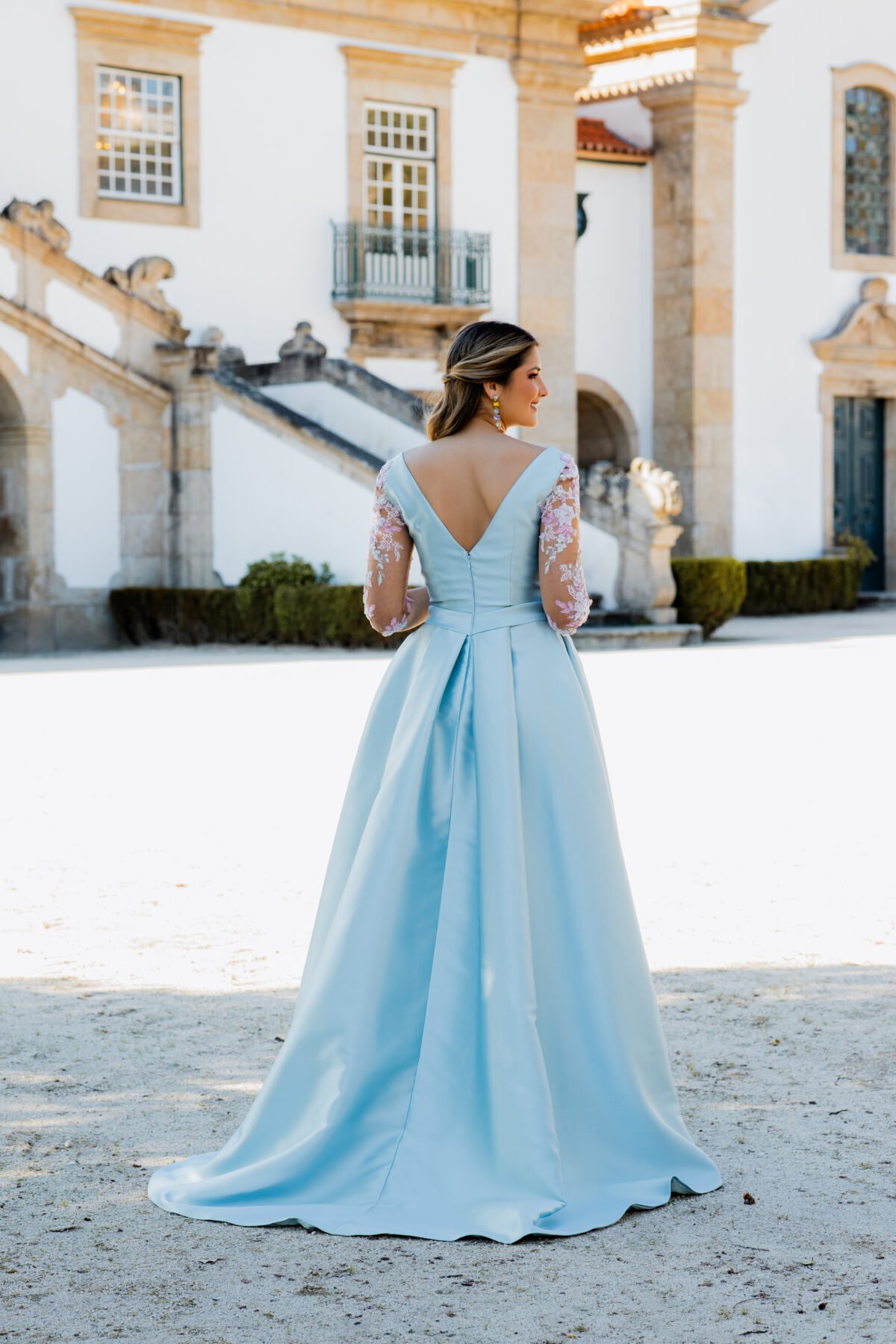 Este vestido longo em tom azul-céu apresenta um corte majestoso e feminino, perfeito para ocasiões especiais. Confecionado em micado estruturado, o modelo possui um corpete ajustado com decote em V profundo que se prolonga nas costas, valorizando a silhueta com elegância. A cintura é marcada por um cinto do mesmo tecido, acentuando a forma. As mangas em tule transparente com bordados florais rosa e branco acrescentam um toque romântico e delicado à composição. A saia ampla com pregas confere-lhe movimento, e uma racha frontal subtil sugere sensualidade com sofisticação.