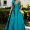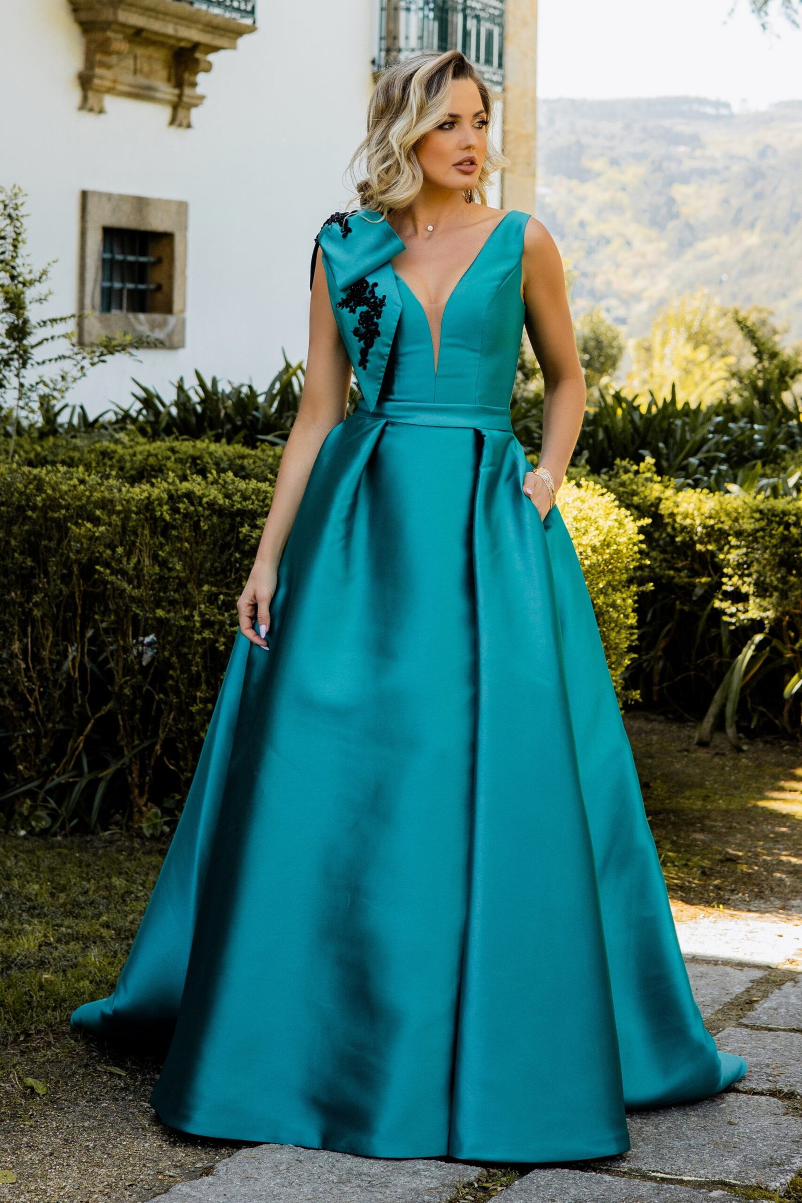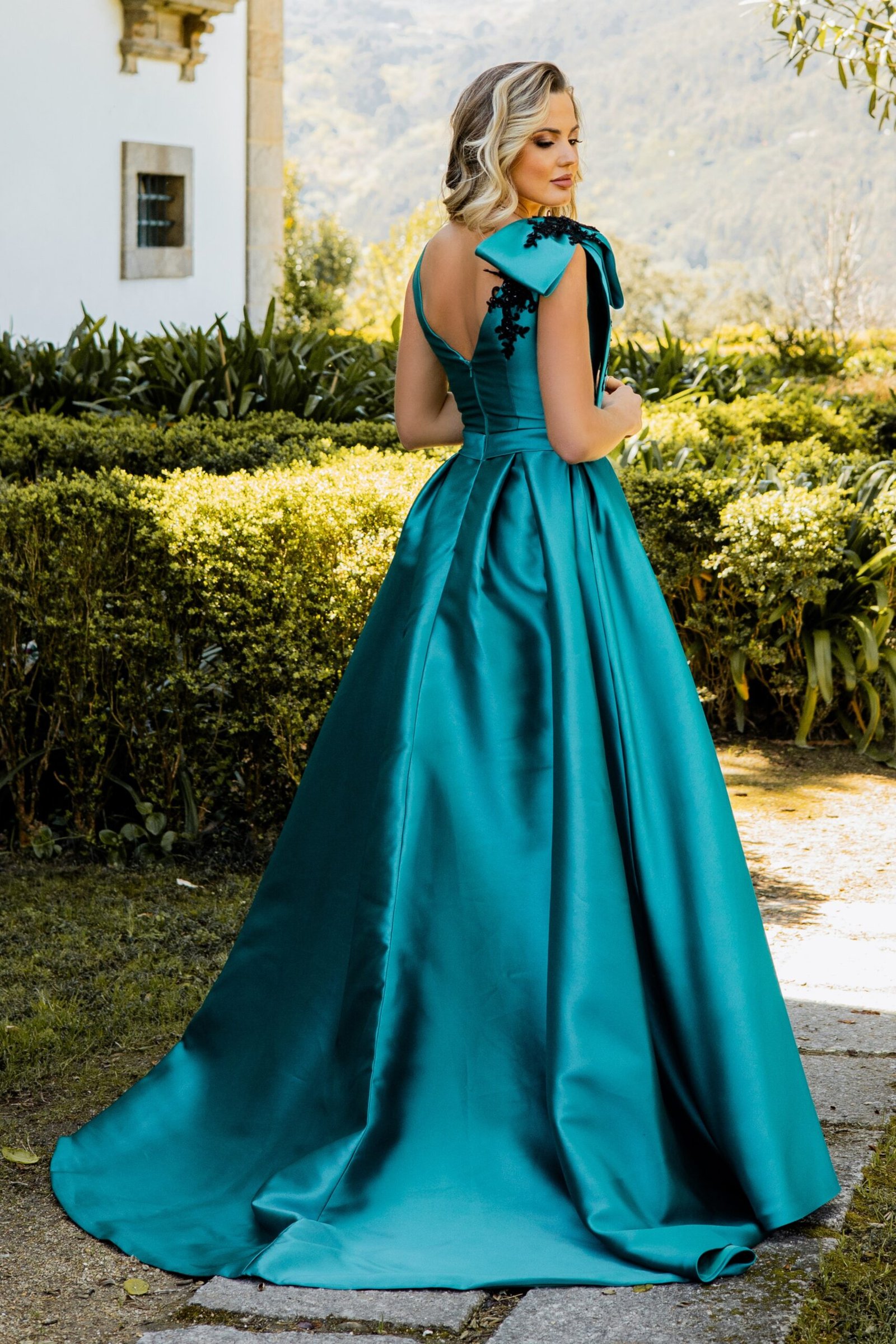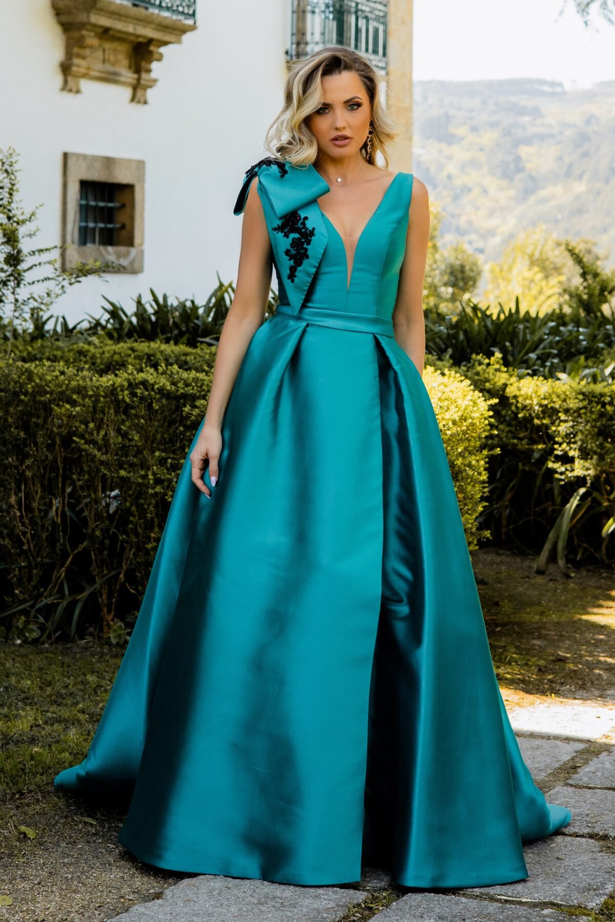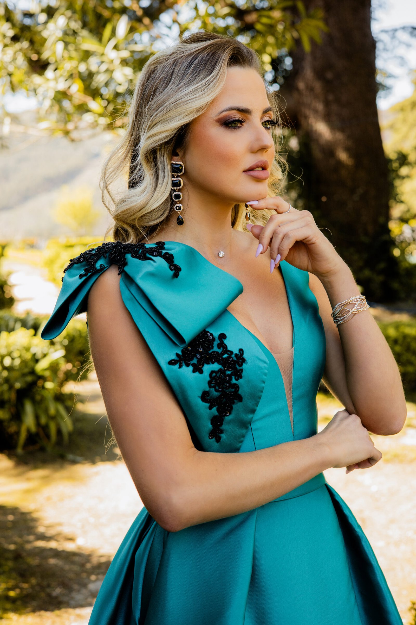 Encantador e imponente, este vestido de gala em verde persa é confecionado em mikado de alta qualidade, com um brilho subtil que realça a elegância a cada movimento. O corpete apresenta um decote profundo em V com tule nude, realçado por uma aplicação floral em pedrarias pretas que adorna o ombro direito, rematada por um laço volumoso para um toque dramático e romântico.