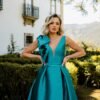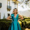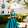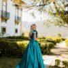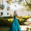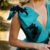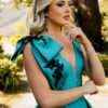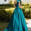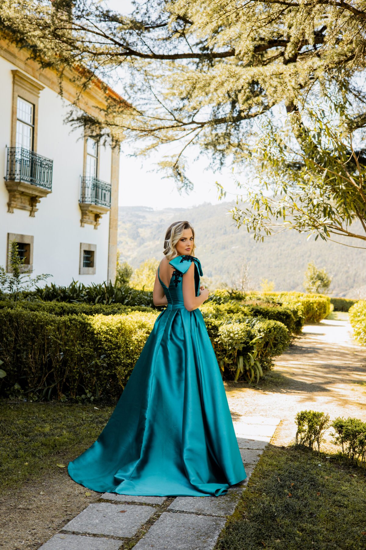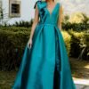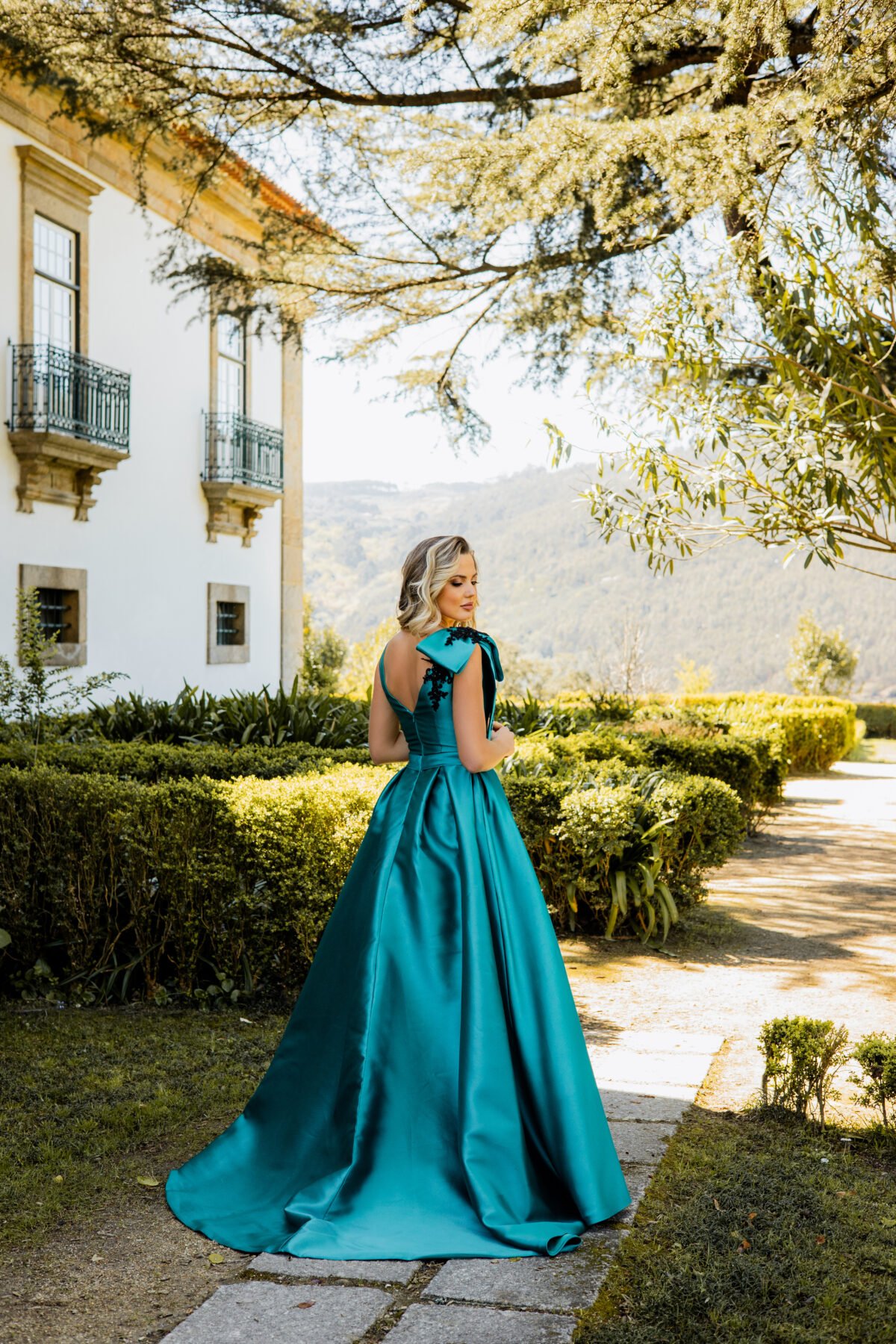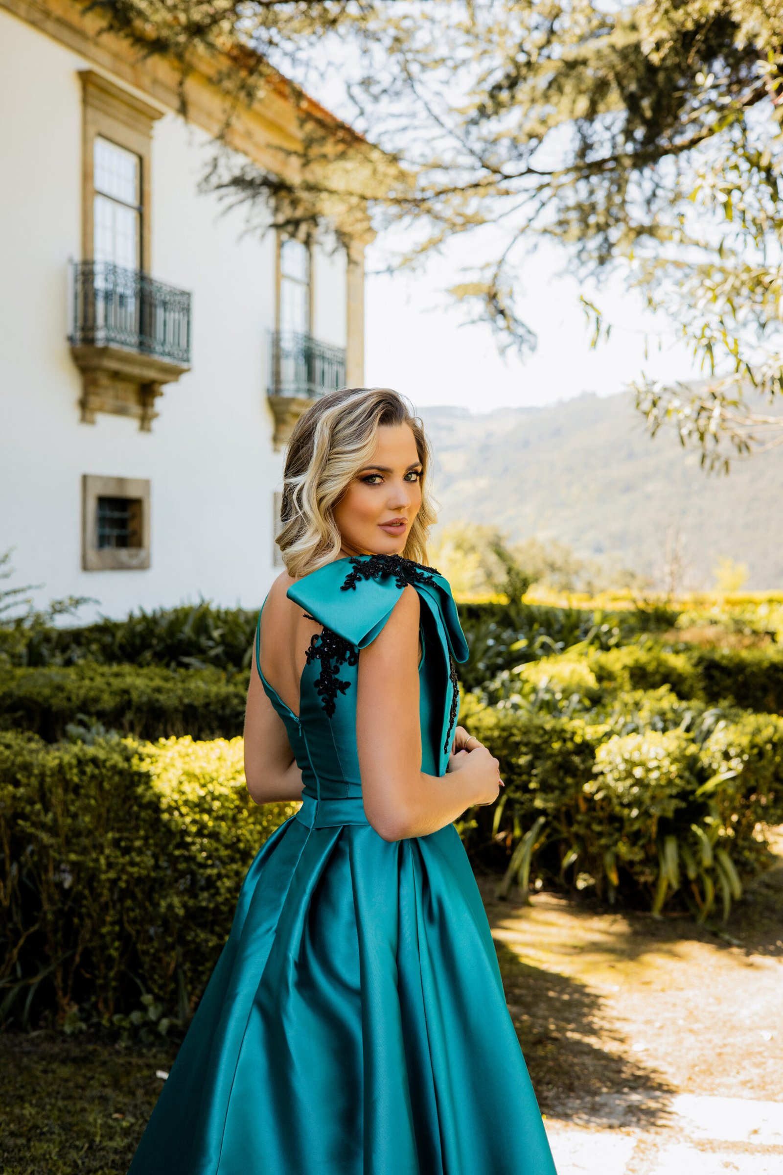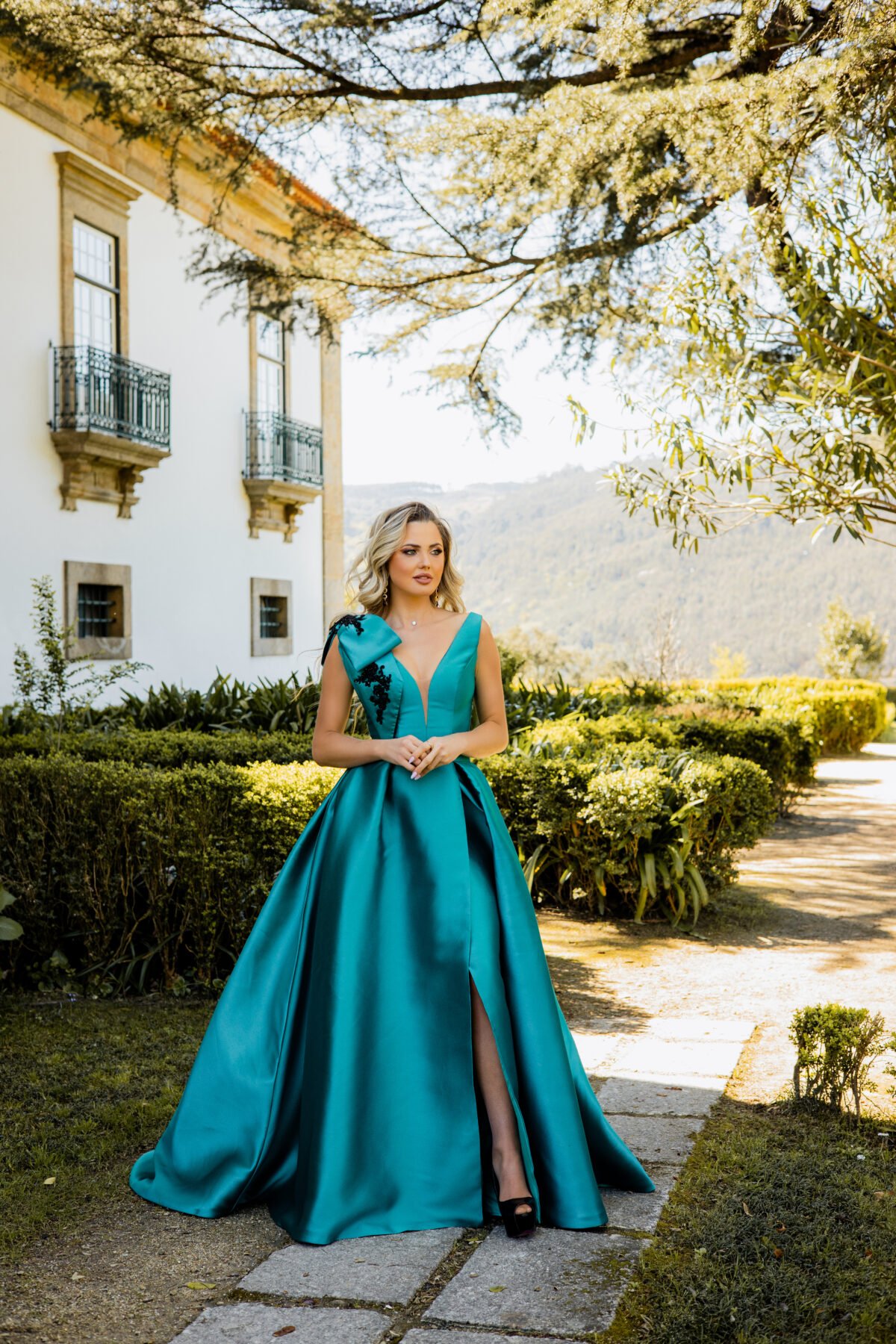 Encantador e imponente, este vestido de gala em verde persa é confecionado em mikado de alta qualidade, com um brilho subtil que realça a elegância a cada movimento. O corpete apresenta um decote profundo em V com tule nude, realçado por uma aplicação floral em pedrarias pretas que adorna o ombro direito, rematada por um laço volumoso para um toque dramático e romântico.