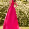 A estrutura ajustada valoriza a silhueta, enquanto a saia volumosa de corte clássico evoca um glamour intemporal e integra discretos bolsos laterais, perfeitos para um toque de praticidade sem comprometer a sofisticação. O decote em V nas costas finaliza o modelo com graciosidade..
