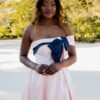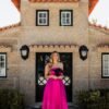 Encantador e sofisticado, este vestido longo em fúcsia é a escolha perfeita para cerimónias elegantes e momentos especiais. O modelo destaca-se pelo corpete estruturado com decote ombro a ombro e um exuberante laço preto, que acrescenta um contraste marcante e requintado.