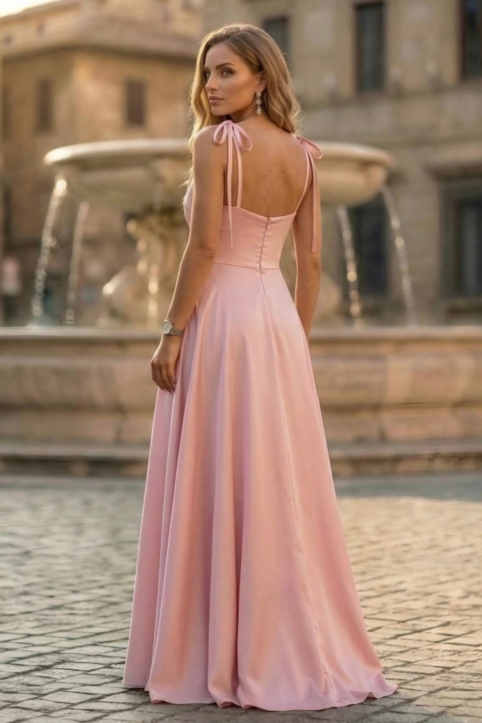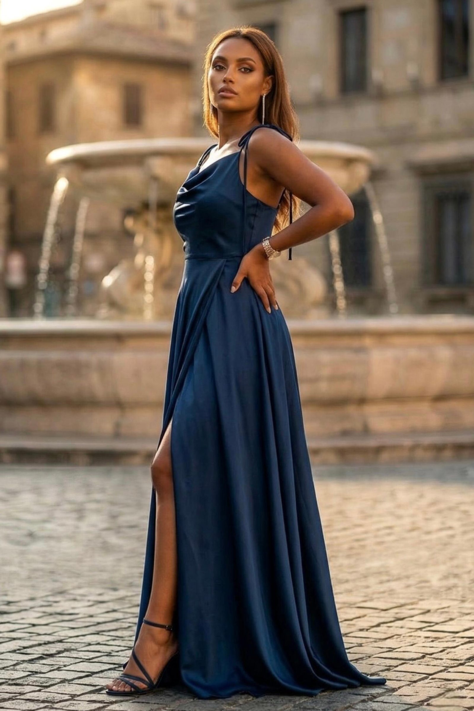 Na parte superior, o modelo apresenta um decote drapeado tipo cascata, que suaviza a linha do busto e acrescenta um toque requintado ao conjunto. As alças finas com laço reforçam a delicadeza da peça e ajudam a criar um acabamento romântico e elegante. Ao mesmo tempo, a cintura marcada define a silhueta com equilíbrio e realça o caimento do vestido de forma muito favorecedora.