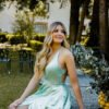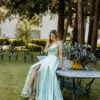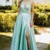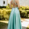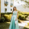 Este deslumbrante vestido de cerimónia é a escolha perfeita para quem procura um visual jovem, elegante e encantador. Com um corte fluido em tecido de cetim brilhante verde sage, o modelo destaca-se pelo seu decote profundo em V e alças cruzadas nas costas, que criam um efeito sofisticado e sedutor.