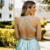 O modelo conta ainda com bolsos laterais discretos, acrescentando um toque de conforto sem comprometer a elegância. As costas abertas com tiras cruzadas e detalhe em pedraria tornam o vestido ainda mais memorável.