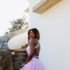 A cintura é marcada por um delicado cinto de pedraria, que acrescenta brilho e definição à silhueta. A saia de caimento leve e rodado possui uma racha frontal, que acrescenta movimento e sensualidade à peça, ideal para momentos especiais ao ar livre.