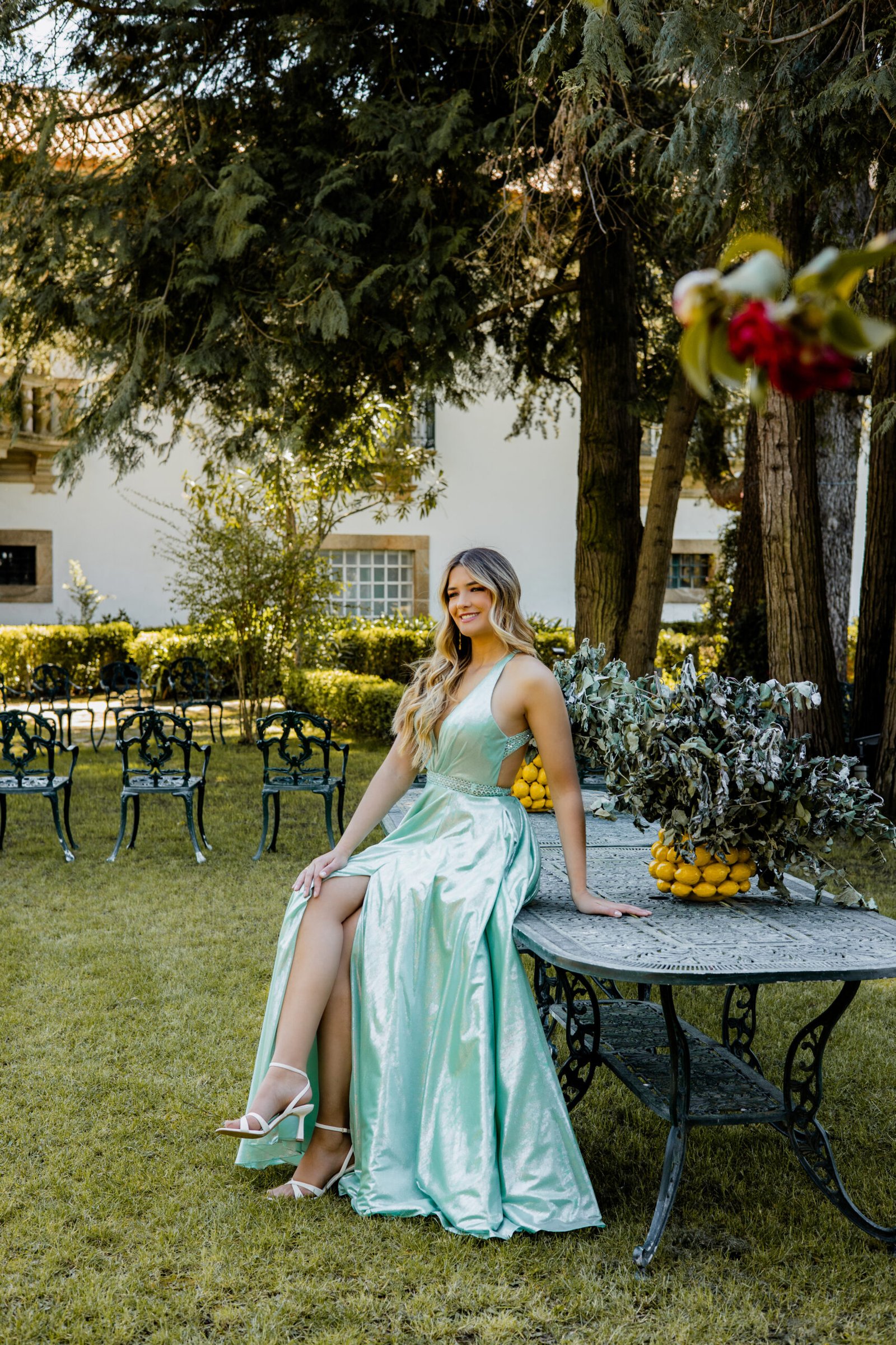 Este deslumbrante vestido de cerimónia é a escolha perfeita para quem procura um visual jovem, elegante e encantador. Com um corte fluido em tecido de cetim brilhante verde sage, o modelo destaca-se pelo seu decote profundo em V e alças cruzadas nas costas, que criam um efeito sofisticado e sedutor.