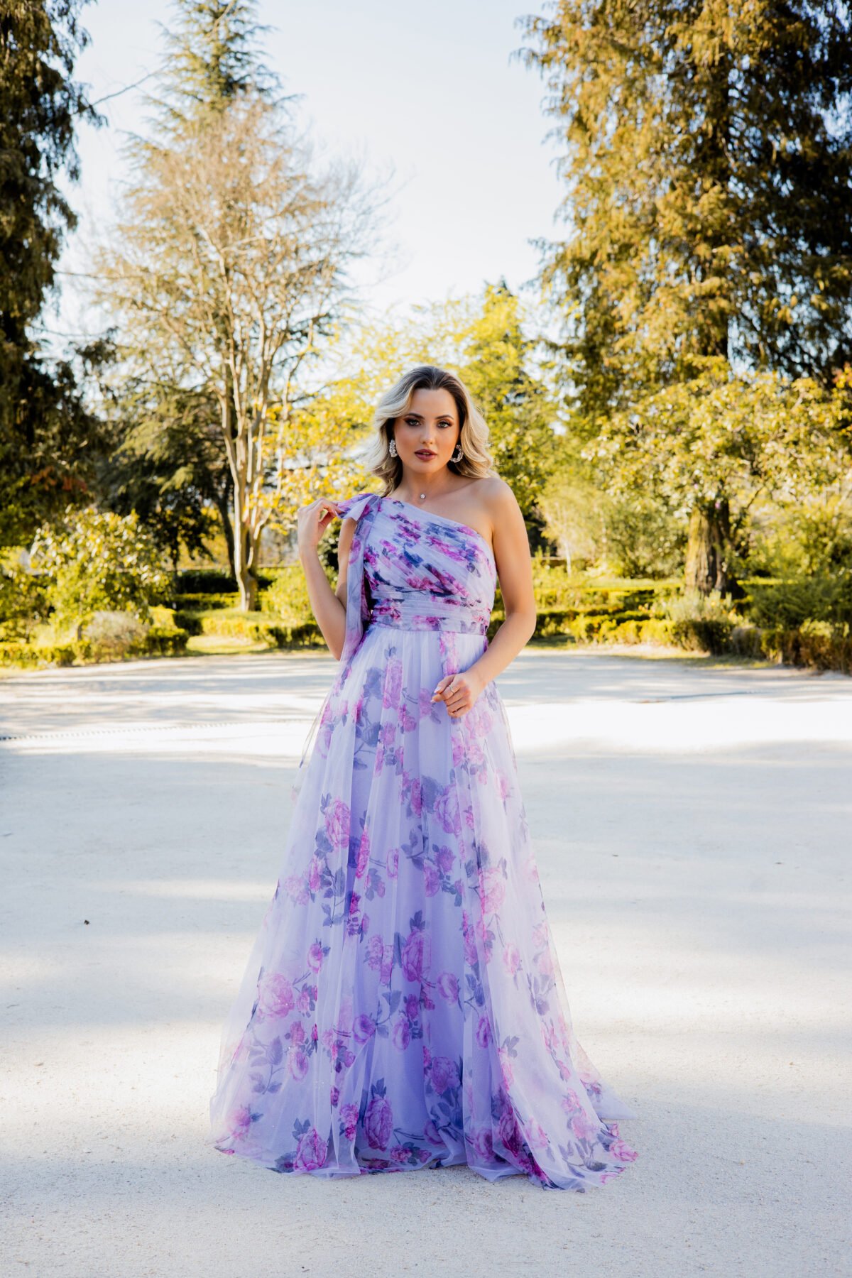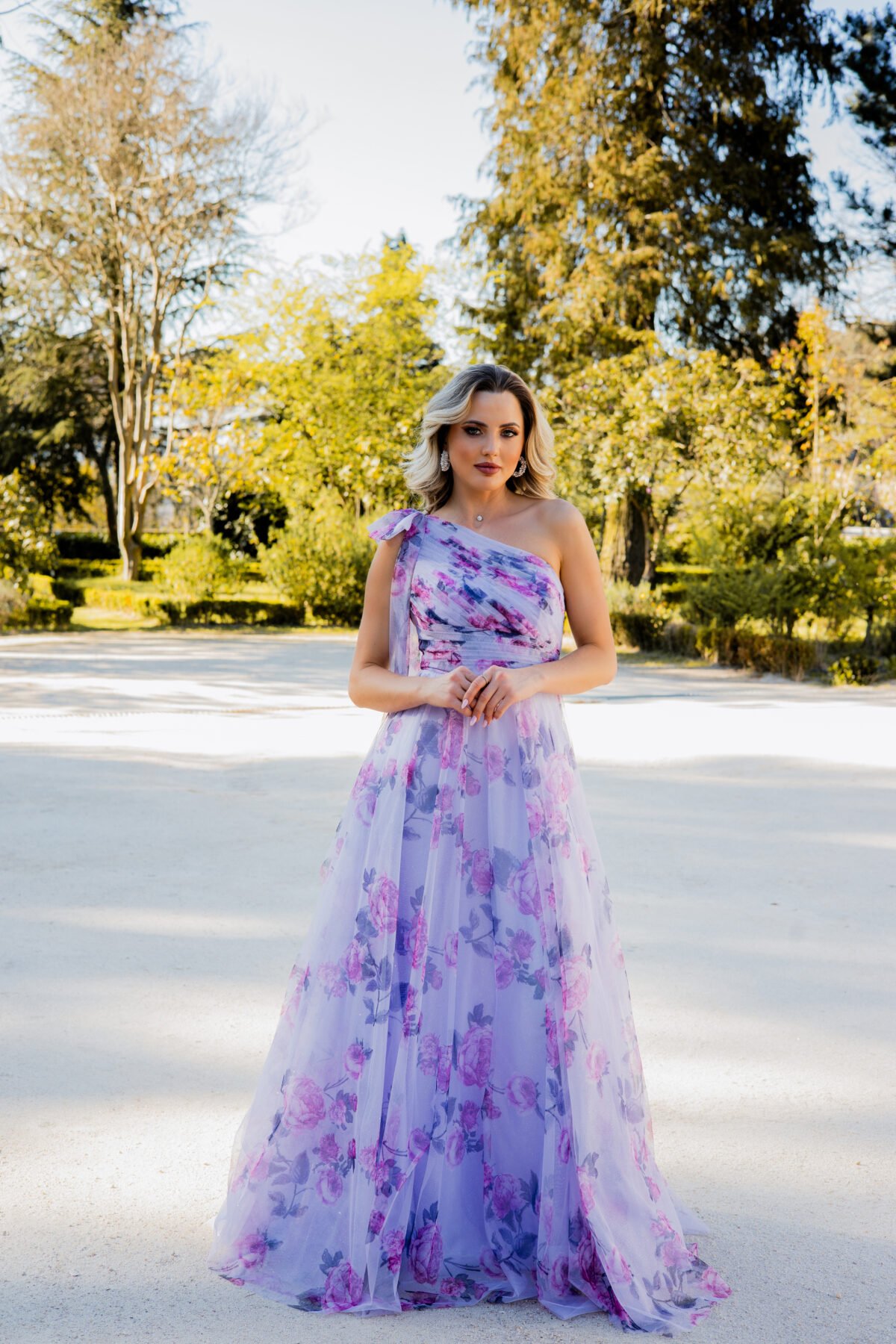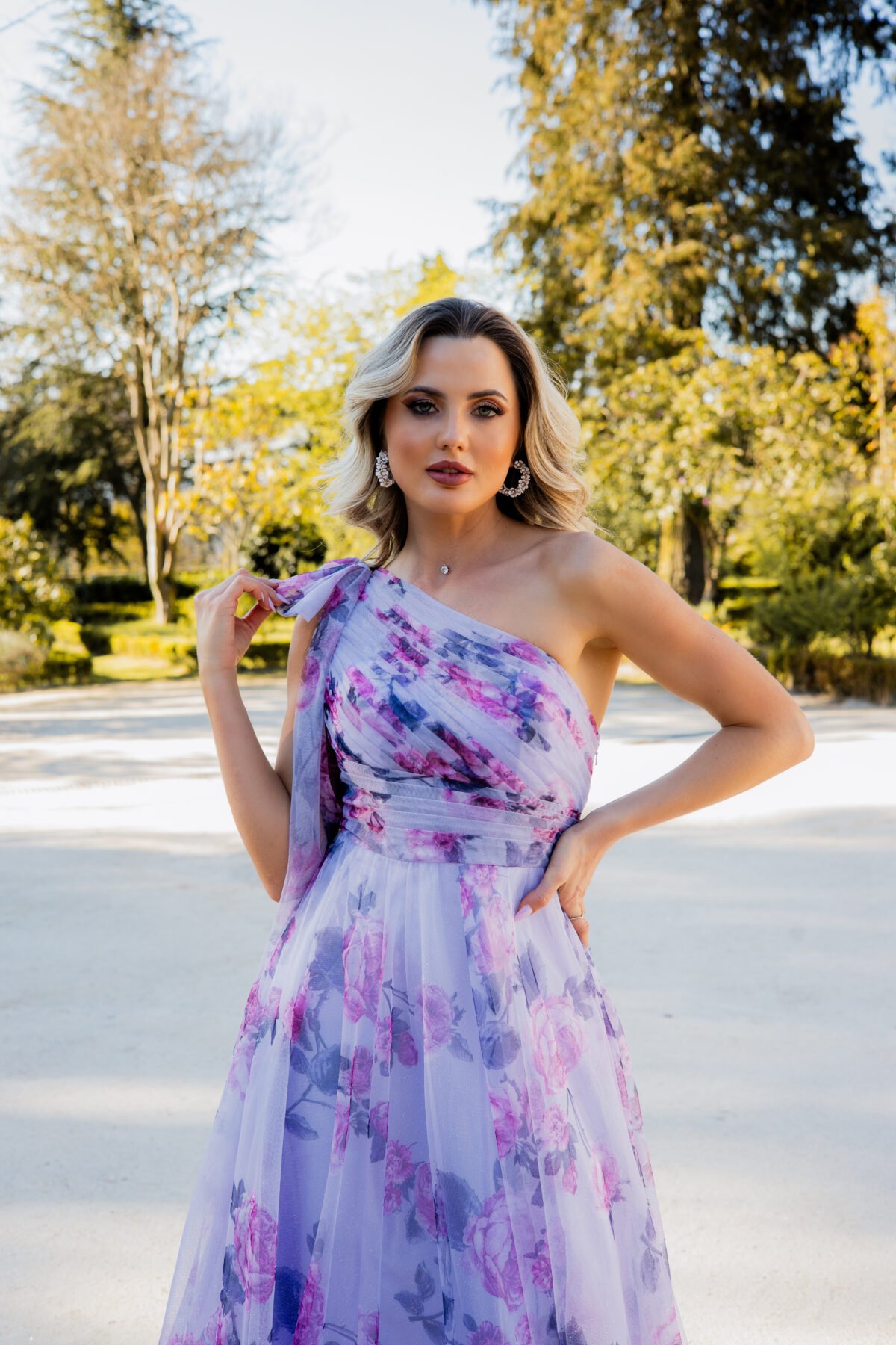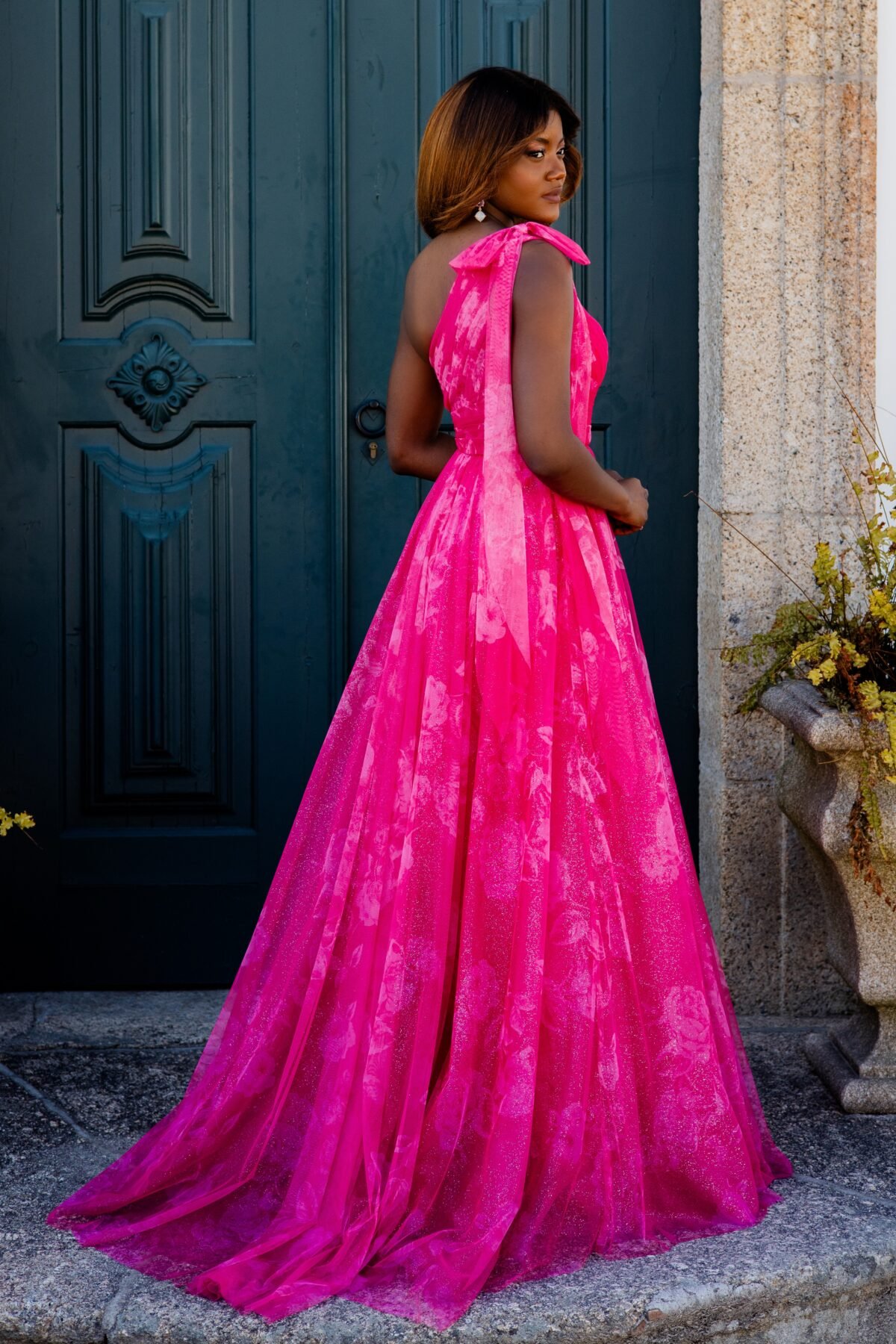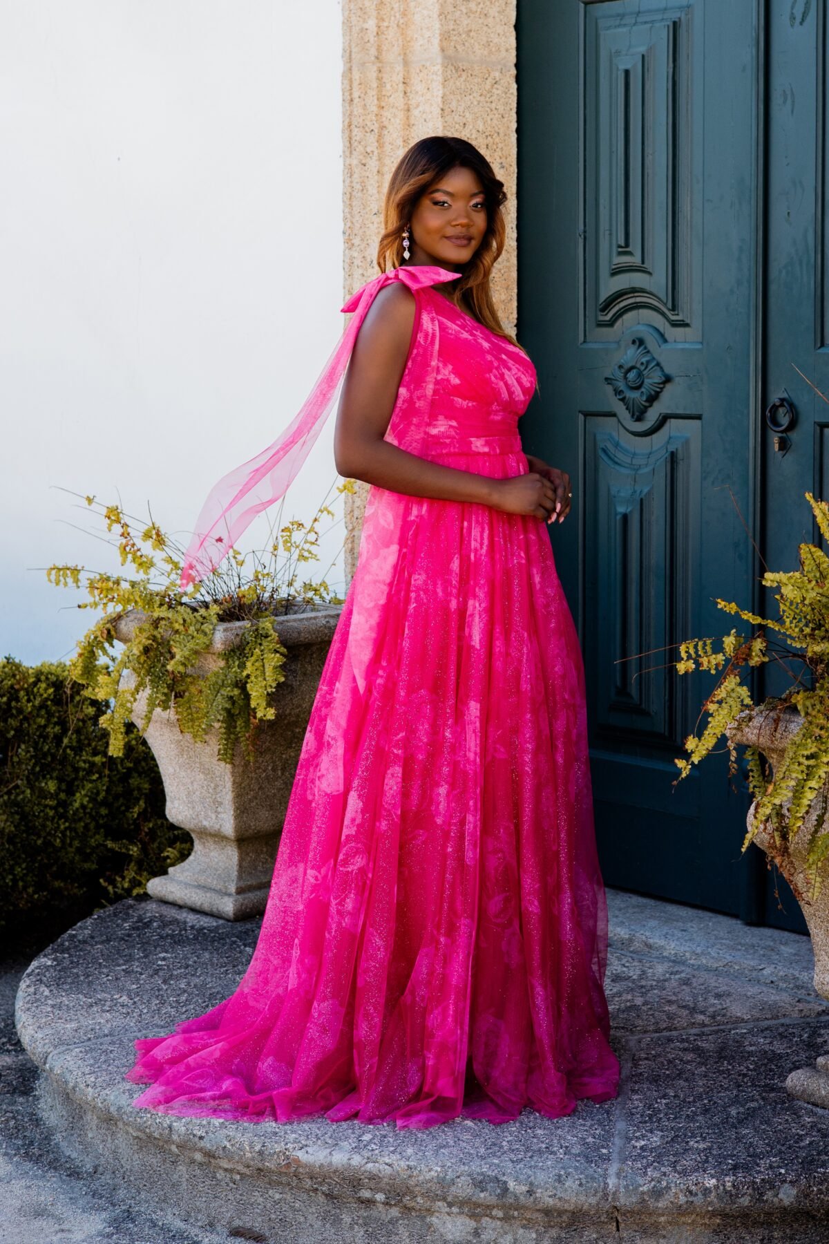 Celebre a delicadeza e o romantismo com este vestido de cerimónia fúcsia em tule estampado floral — uma escolha perfeita para eventos ao ar livre, casamentos ou ocasiões onde a leveza e a feminilidade são protagonistas. Com um corte fluido e estampado em tons suaves de rosa e lavanda, este modelo alia graciosidade e frescura com um toque etéreo.