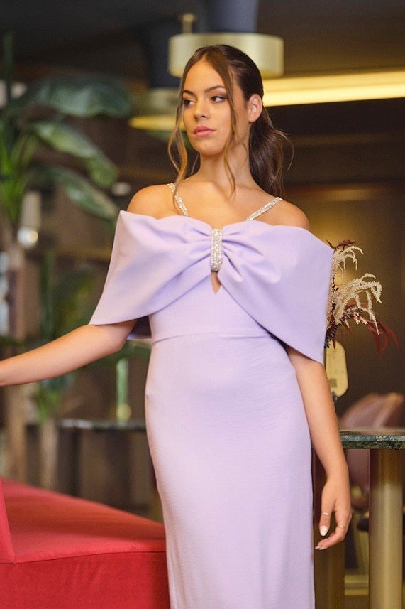 Um vestido que combina charme contemporâneo com sofisticação intemporal. Este modelo em tom malva destaca-se pelo grande laço estruturado que emoldura tanto a frente como as costas, criando um efeito visual único e majestoso.
