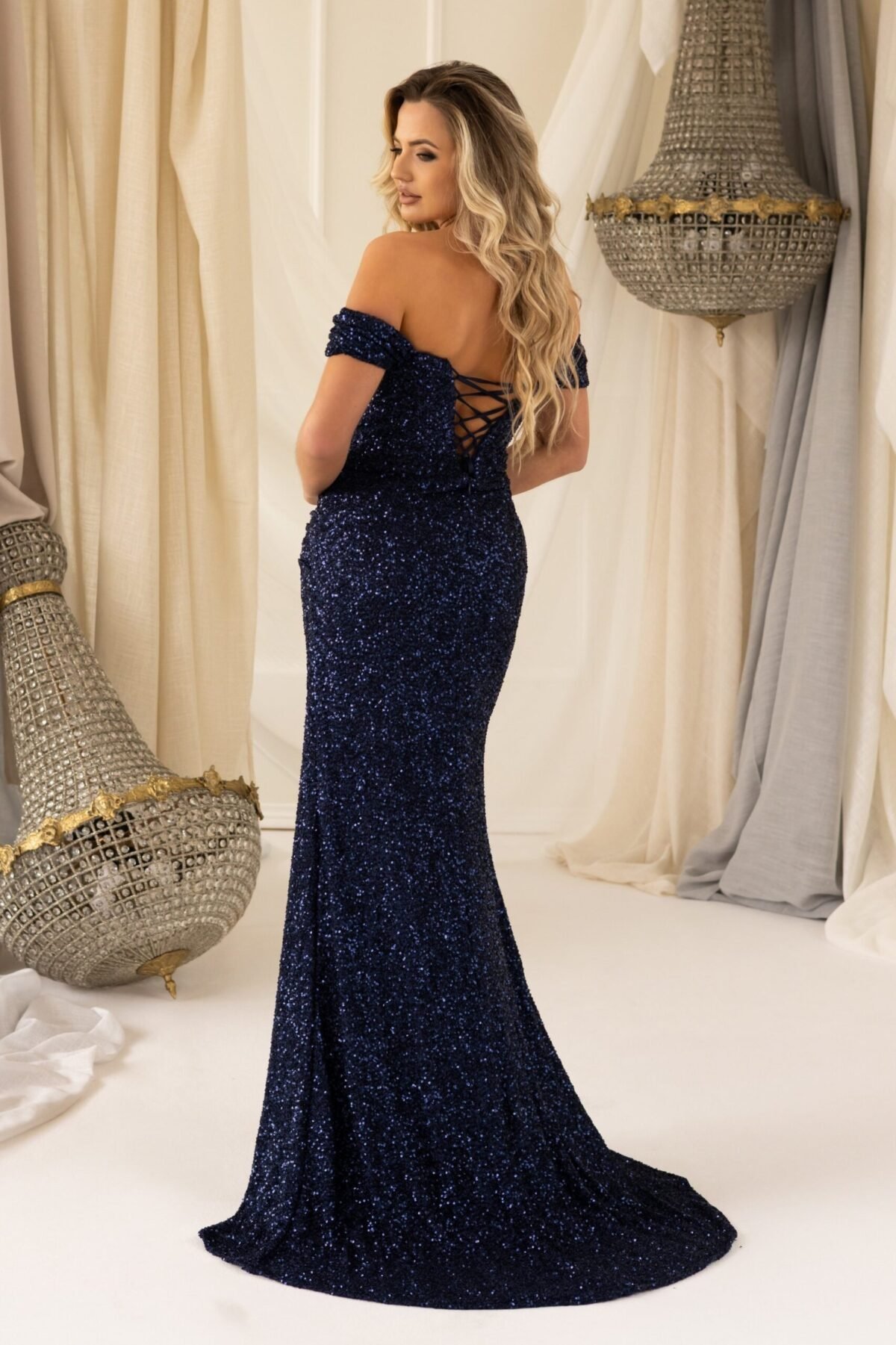 Confecionado em tecido totalmente bordado com lantejoulas no tom azul marinho, com um decotes coração com drapeado que realça o busto e alças caídas que acrescenta um toque sensual e romântico ao mesmo tempo.