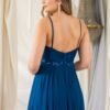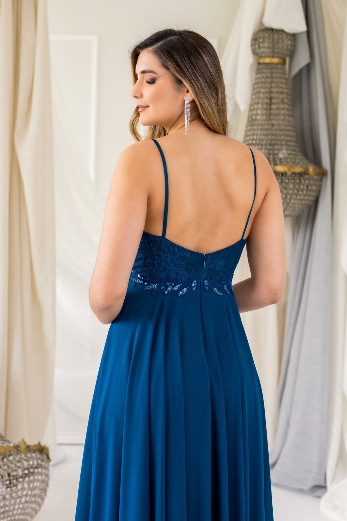 Um vestido deslumbrante em azul petróleo confecionado em chiffon, este vestido destaca-se pela sua presença sofisticada e rica em detalhes.