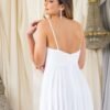 As alças finas acrescentam leveza ao visual e criam um contraste encantador com as costas abertas, que revelam uma linha delicada em V. A saia fluida, confecionada em chiffon leve e esvoaçante, cai em pregas suaves que acompanham o caminhar com graciosidade.