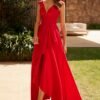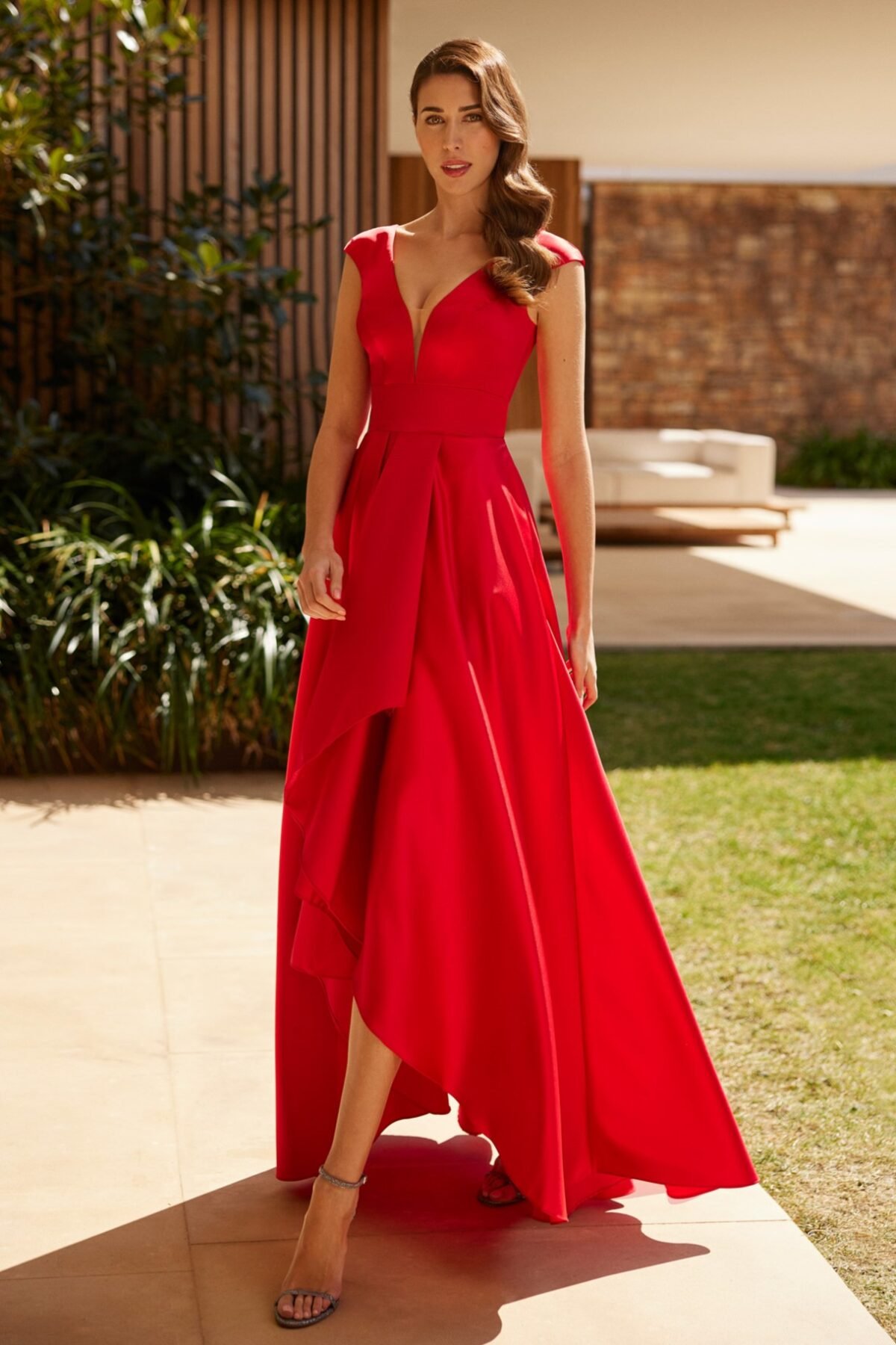 • Design: Modelo longo assimétrico na cor vermelho, com saia volumosa e caimento fluido, garantindo movimento e sofisticação.