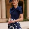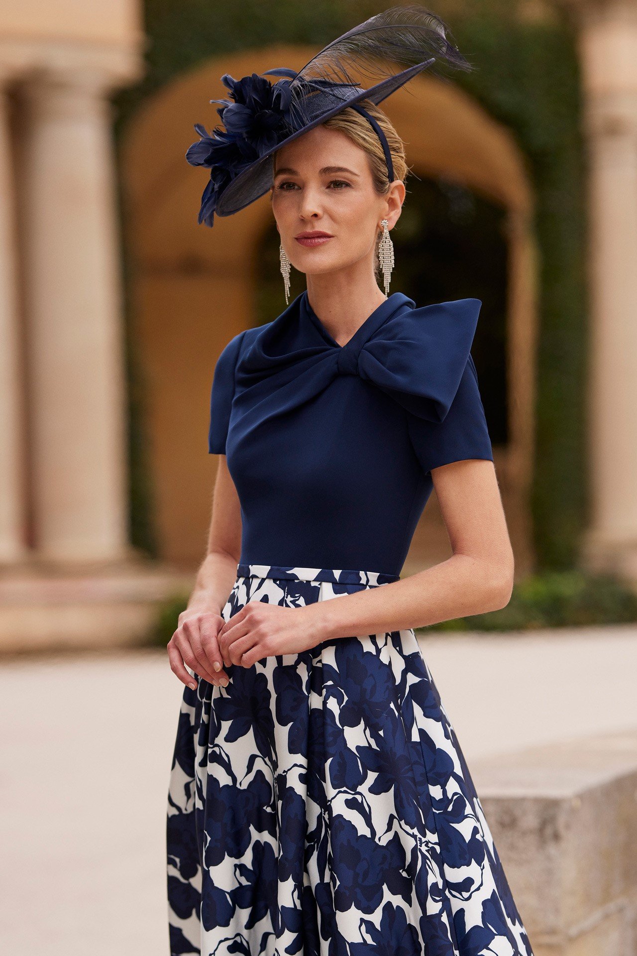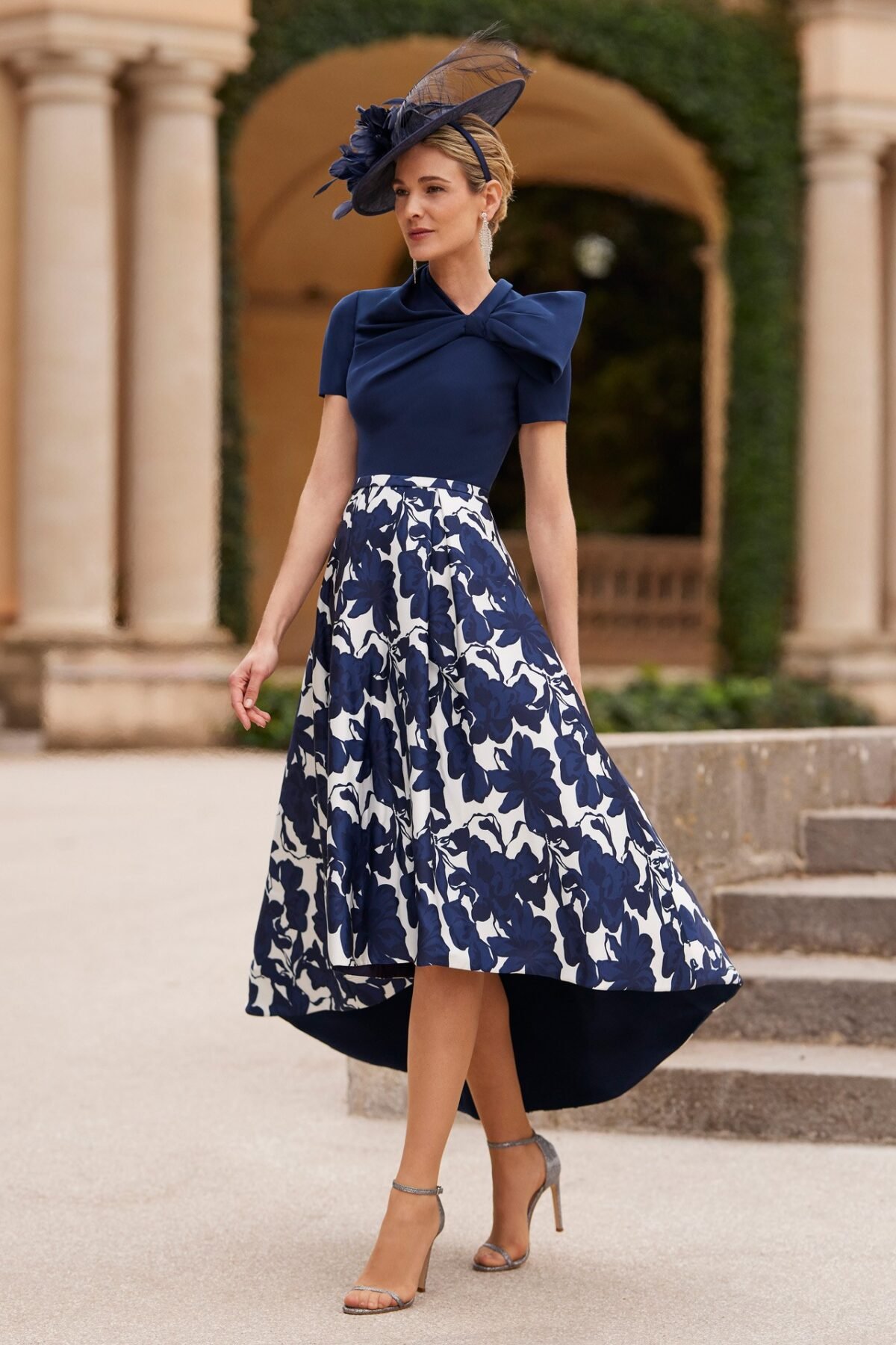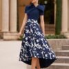 A parte superior, em um tom azul marinho liso e sofisticado, com gola redonda estruturada e mangas curtas , destacando um detalhe único: um charmoso laço lateral que adiciona um toque feminino e refinado. A saia estampada fluida com padrão floral e corte assimétrico high-low proporciona leveza, movimento e um ar contemporâneo ao look.