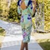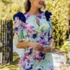 Com um estampado floral em tons suaves e contrastantes, este modelo distingue-se pelo decote em gota à frente, mangas 3/4 e decote aberto nas costas, criando um equilíbrio perfeito entre romantismo e sensualidade.
