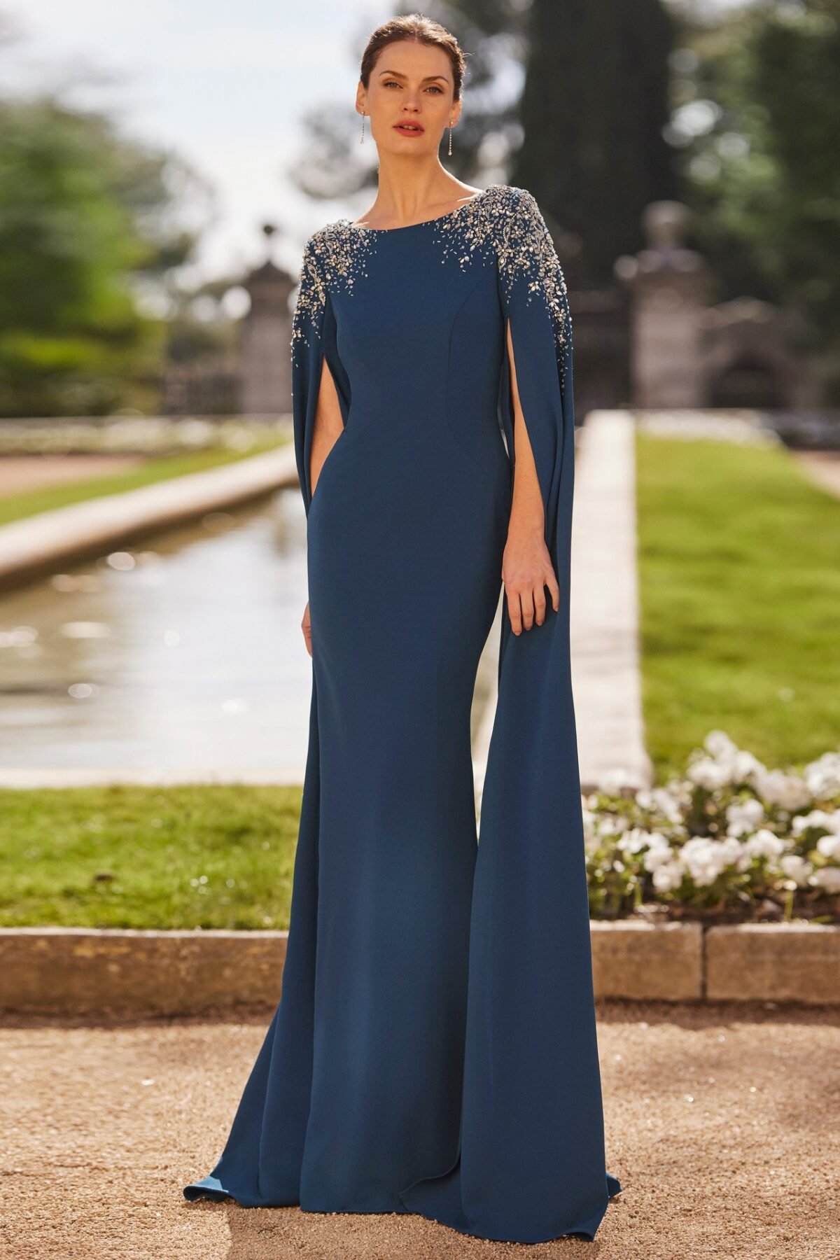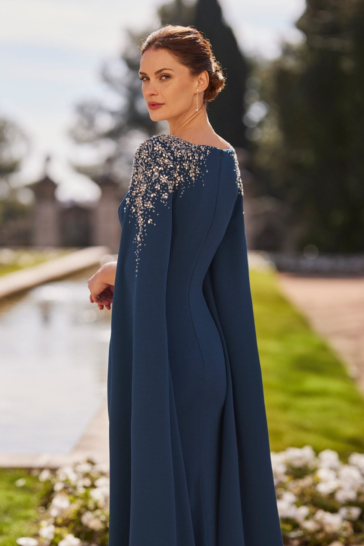 O decote barco traz um toque clássico e refinado, equilibrando perfeitamente a silhueta. As mangas capa esvoaçantes adicionam um efeito majestoso e fluído, conferindo um visual de realeza. O detalhe mais encantador está nos ombros bordados com pedraria, que criam um brilho sutil e luxuoso, elevando ainda mais a sofisticação da peça.