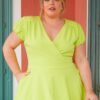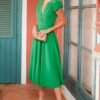 Encantador e cheio de frescura, este vestido midi em verde é a escolha perfeita para iluminar os dias mais quentes com elegância e leveza. Confecionado em crepe leve e fluido, o modelo apresenta um decote transpassado em V que valoriza o colo com delicadeza, enquanto as mangas curtas com leve franzido nos ombros acrescentam um toque romântico.