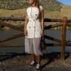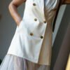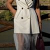 Este vestido/colete bege com detalhe em tule é a peça ideal para mulheres que procuram sofisticação aliada à versatilidade. Com um design que combina alfaiataria clássica e detalhes femininos, é uma escolha perfeita para criar looks modernos, distintos e adaptáveis a várias ocasiões.