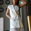 Na parte superior, o corte remete ao estilo colete de alfaiataria, com lapela estruturada, botões dourados duplos e linhas elegantes que alongam a silhueta. O acabamento impecável transmite modernidade e requinte, enquanto o tom bege neutro acrescenta um toque intemporal e versátil, fácil de coordenar com diferentes cores e estilos.