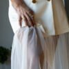 A grande surpresa está na parte inferior: o detalhe em tule translúcido, que confere leveza e movimento ao conjunto. Esta fusão entre a estrutura firme do colete e a fluidez do tule cria uma harmonia sofisticada, tornando a peça única e cheia de personalidade.