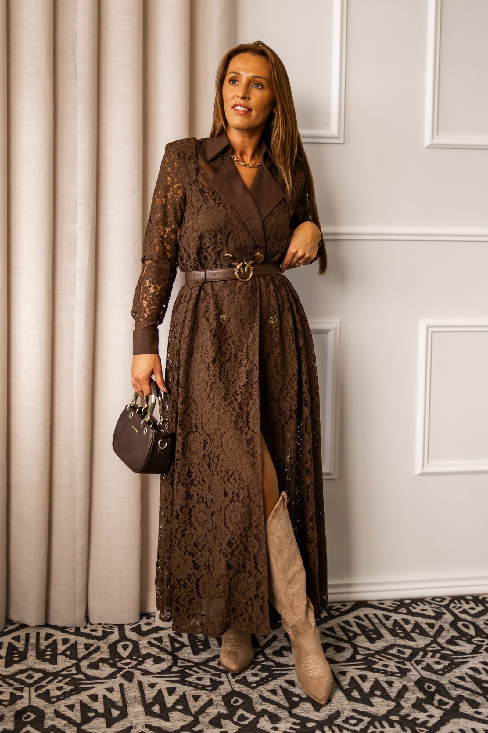 Vestido Comprido em Renda Castanho, uma peça que combina sofisticação e romantismo num design intemporal. Ideal para ocasiões especiais ou para um look de outono-inverno requintado, este vestido distingue-se pela sua textura rica e pelos detalhes de alfaiataria que elevam o visual.