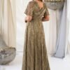 Este vestido longo é confecionado em tecido lurex, leve e fluído na tonalidade verde khaki. Enriquecido com delicados fios dourados que adiciona um brilho subtil. Seu design elegante apresenta um decote em V transpassado, que valoriza o colo e proporcionando um caimento confortável.