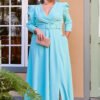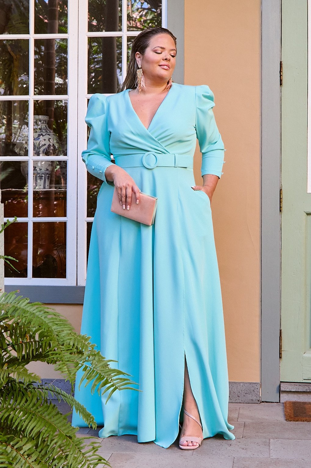 Essa opção é maravilhosa! Vestido confecionado em crepe no tom verde água com mangas bufantes e decote transpassado com um caimento impecável e super elegante. O cinto forrado no mesmo tecido e cor dá aquele toque de sofisticação, e os bolsos são sempre um bônus prático e estiloso.